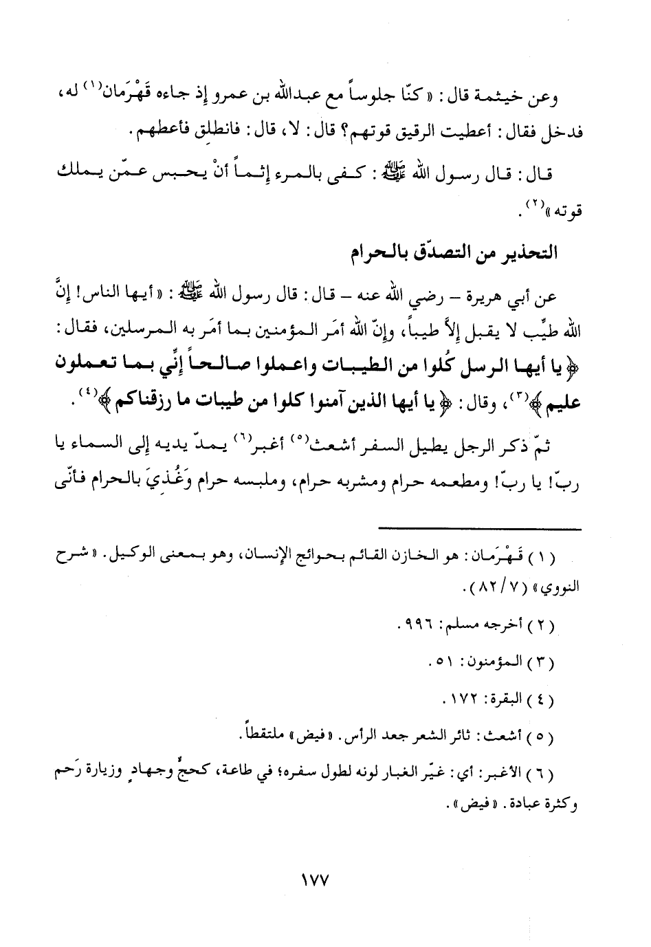 ثمّ ذكر الرجل يطيل السفر أشعث (¬5) أغبر (¬6) يمدّ يديه إِلى السماء يا ربّ! يا ربّ! ومطعمه حرام ومشربه حرام، وملبسه حرام وَغُذِيَ بالحرام فأنّى