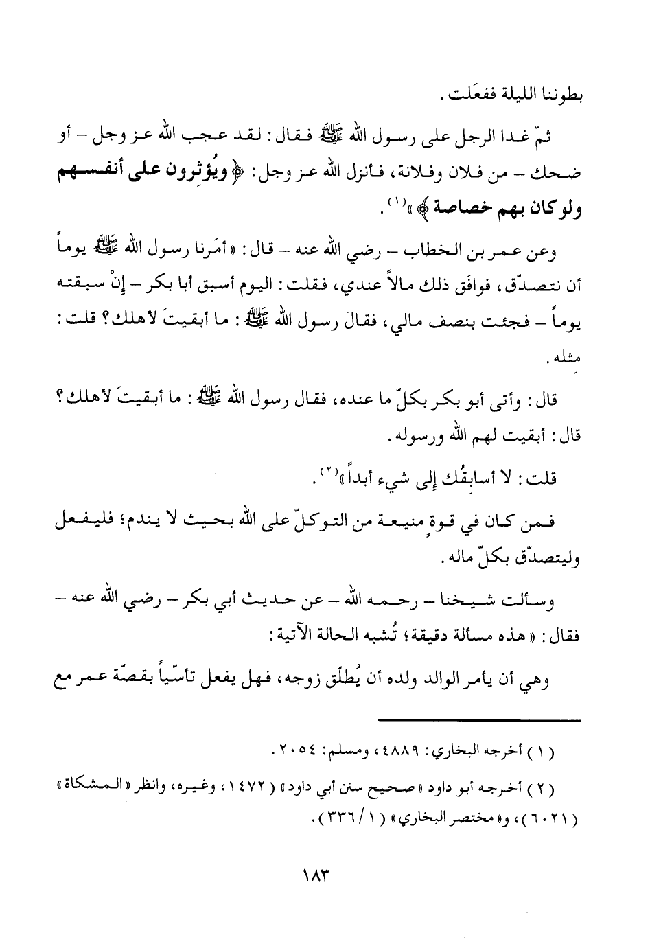 وعن عمر بن الخطاب -رضي الله عنه- قال: "أمَرنا رسول الله - صَلَّى اللَّهُ عَلَيْهِ وَسَلَّمَ - يوماً أن نتصدّق، فوافَق ذلك مالاً عندي، فقلت: اليوم أسبق أبا بكر -إِنْ سبقته يوماً- فجئت بنصف مالي، فقال رسول الله - صَلَّى اللَّهُ عَلَيْهِ وَسَلَّمَ -: ما أبقيتَ لأهلك؟ قلت: مِثله.