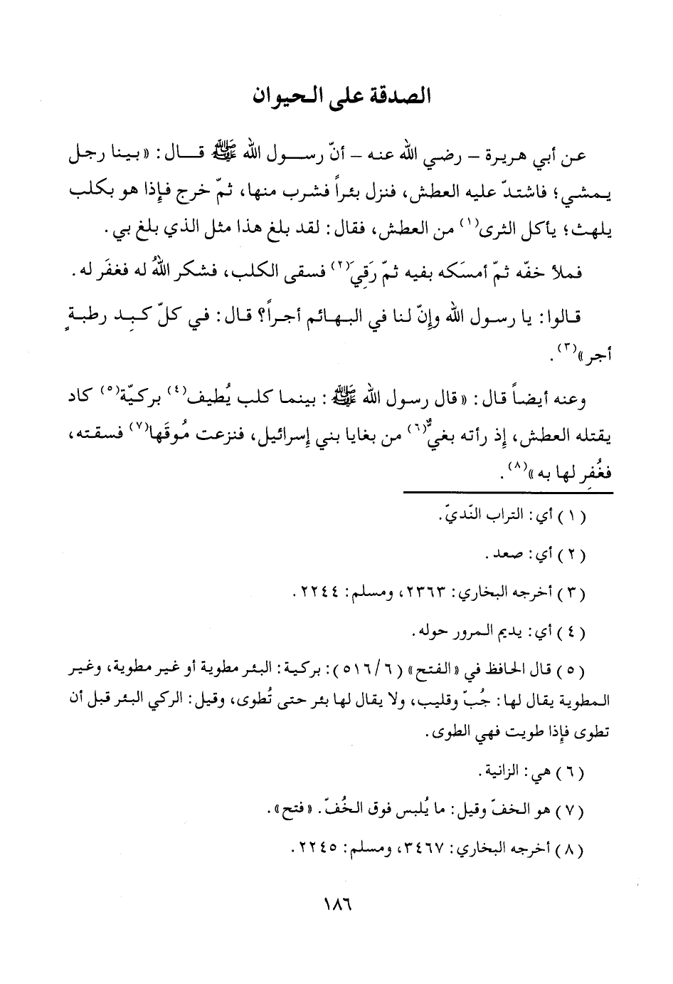 عن أبي هريرة -رضي الله عنه- أنّ رسول الله - صَلَّى اللَّهُ عَلَيْهِ وَسَلَّمَ - قال: "بينا رجل يمشي؛ فاشتدّ عليه العطش، فنزل بئراً فشرب منها، ثمّ خرج فإِذا هو بكلب يلهث؛ يأكل الثرى (¬1) من العطش، فقال: لقد بلغ هذا مثل الذي بلغ بي.