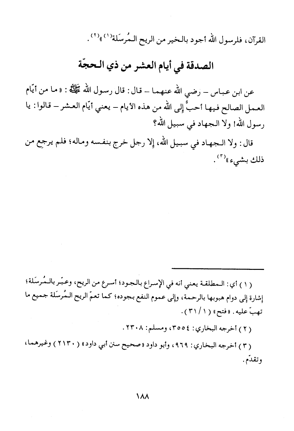 عن ابن عباس -رضي الله عنهما- قال: قال رسول الله - صَلَّى اللَّهُ عَلَيْهِ وَسَلَّمَ -: "ما من أيّام العمل الصالح فيها أحبُّ إِلى الله من هذه الأيام -يعني أيّام العشر- قالوا: يا رسول الله! ولا الجهاد في سبيل الله؟