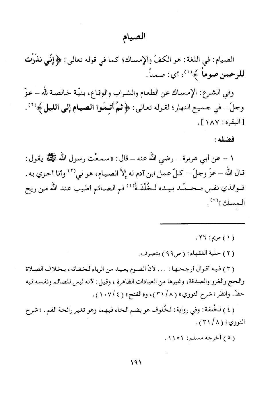 1 - عن أبي هريرة -رضي الله عنه- قال: "سمعْت رسول الله - صَلَّى اللَّهُ عَلَيْهِ وَسَلَّمَ - يقول: قال الله -عزّ وجلّ- كلّ عمل ابن آدم له إلاَّ الصيام، هو لي (¬3) وأنا أجزي به. فوالذي نفس محمّد بيده لَخُلْفَةُ (¬4) فم الصائم أطيب عند الله من ريح المِسك" (¬5).