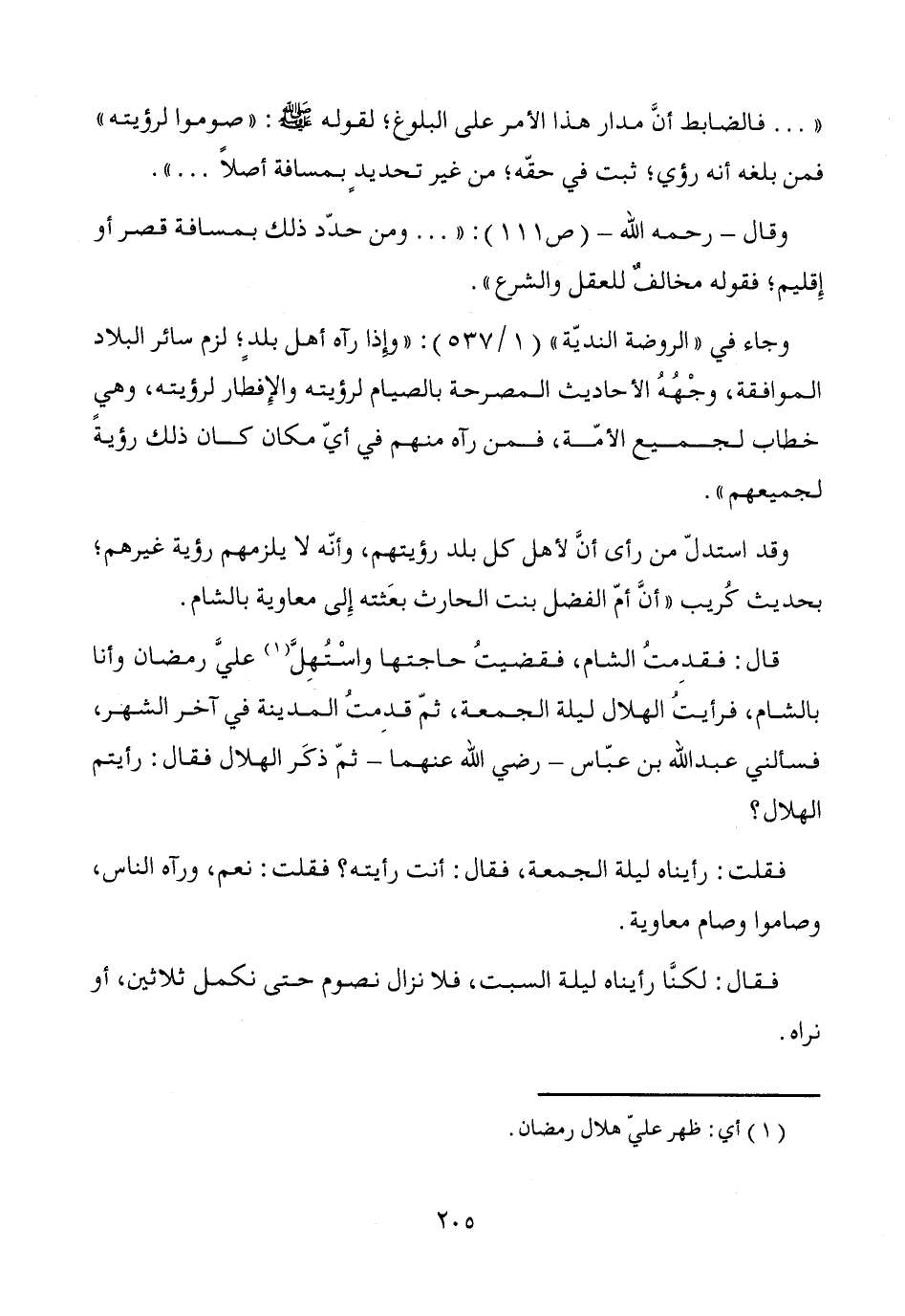 " ... فالضابط أنَّ مدار هذا الأمر على البلوغ؛ لقوله - صَلَّى اللَّهُ عَلَيْهِ وَسَلَّمَ -: "صوموا لرؤيته" فمن بلغه أنه رؤي؛ ثبت في حقّه؛ من غير تحديدٍ بمسافة أصلاً ... ".