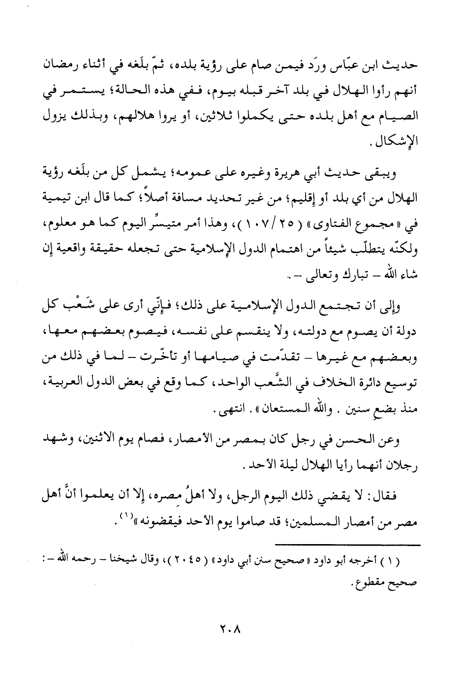 وإلى أن تجتمع الدول الإِسلامية على ذلك؛ فإِنّي أرى على شَعْب كل دولة أن يصوم مع دولته، ولا ينقسم على نفسه، فيصوم بعضهم معها، وبعضهم مع غيرها -تقدّمت في صيامها أو تأخّرت- لما في ذلك من توسيع دائرة الخلاف في الشَّعب الواحد، كما وقع في بعض الدول العربية، منذ بضع سنين. والله المستعان". انتهى.