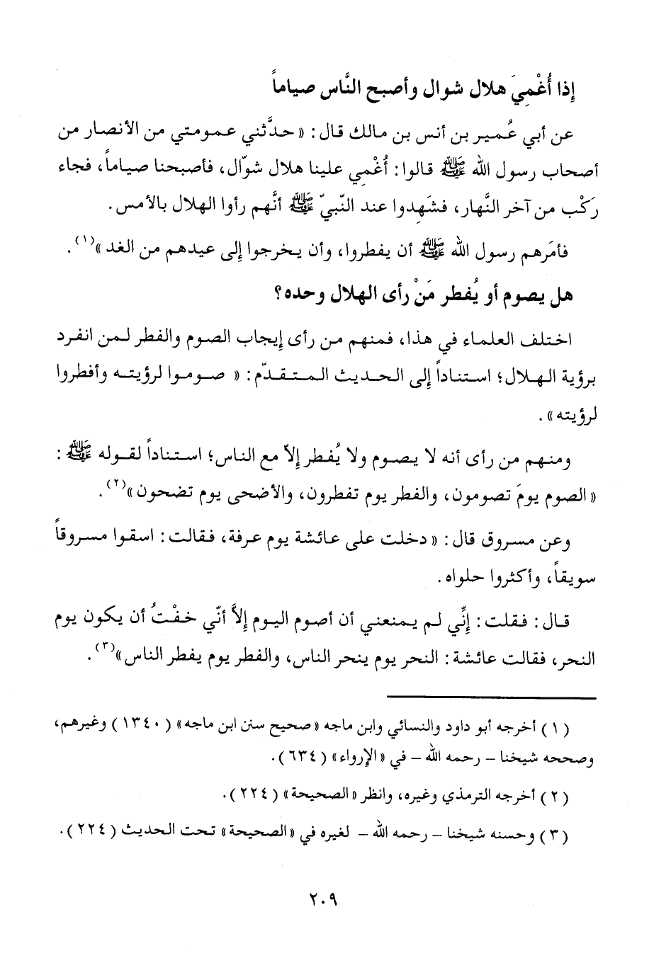 ومنهم من رأى أنه لا يصوم ولا يُفطر إلاَّ مع الناس؛ استناداً لقوله - صَلَّى اللَّهُ عَلَيْهِ وَسَلَّمَ -: "الصوم يومَ تصومون، والفطر يوم تفطرون، والأضحى يوم تضحون" (¬2).