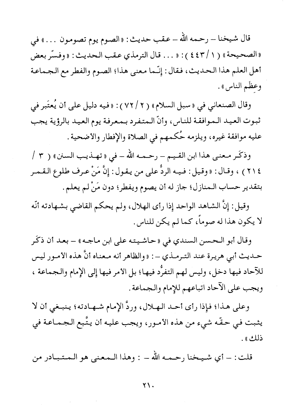 قال شيخنا -رحمه الله- عقب حديث: "الصوم يوم تصومون ... " في "الصحيحة" (1/ 443): " ... قال الترمذي عقب الحديث: "وفسّر بعض أهل العلم هذا الحديث، فقال: إِنّما معنى هذا؛ الصوم والفطر مع الجماعة وعِظَم الناس".