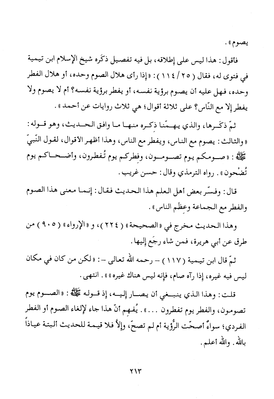 ثمّ ذكَرها، والذي يهمّنا ذِكره منها ما وافق الحديث، وهو قوله: "والثالث: يصوم مع الناس، ويفطر مع الناس، وهذا أظهر الأقوال، لقول النّبيّ - صَلَّى اللَّهُ عَلَيْهِ وَسَلَّمَ -: "صومكم يوم تصومون، وفِطركم يوم تُفطرون، وأضحاكم يوم تُضْحون". رواه الترمذي وقال: حسن غريب.