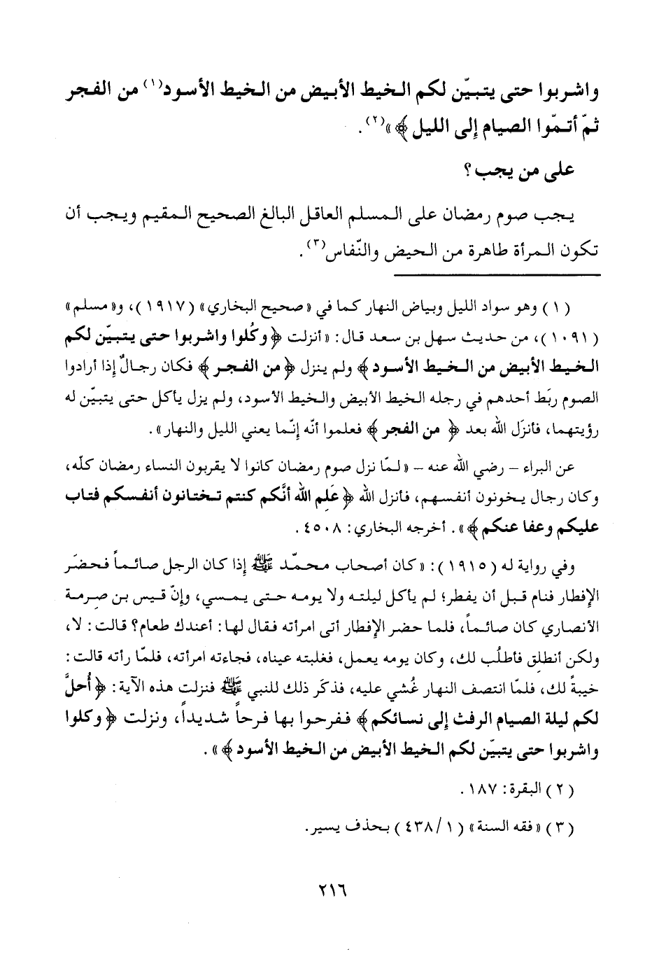 واشربوا حتى يتبيّن لكم الخيط الأبيض من الخيط الأسود (¬1) من الفجر ثمّ أتمّوا الصيام إِلى الليل} " (¬2).