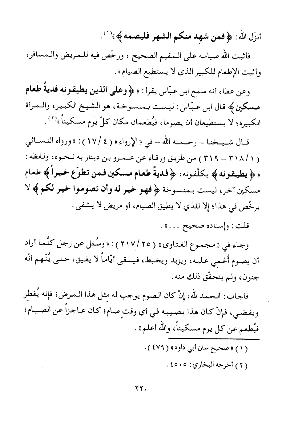 قال شيخنا -رحمه الله- في "الإِرواء" (4/ 17): "ورواه النسائي (1/ 318 - 319) من طريق ورقاء عن عمرو بن دينار به نحوه، ولفظه: " {يطيقونه} يكلَّفونه، {فديةٌ طعام مسكين فمن تطوّع خيراً} طعام مسكين آخر، ليست بمنسوخة {فهو خير له وأن تصوموا خير لكم} لا يرخّص في هذا؛ إِلا للذي لا يطيق الصيام، أو مريض لا يشفى.