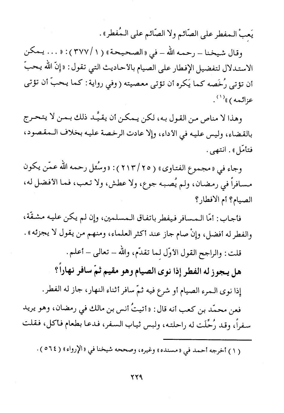 وقال شيخنا -رحمه الله- في "الصحيحة" (1/ 377): " ... يمكن الاستدلال لتفضيل الإِفطار على الصيام بالأحاديث التي تقول: "إِنّ الله يحبّ أن تؤتى رُخَصه كما يَكره أن تؤتى معصيته (وفي رواية: كما يحبّ أن تؤتى عزائمه) " (¬1).
