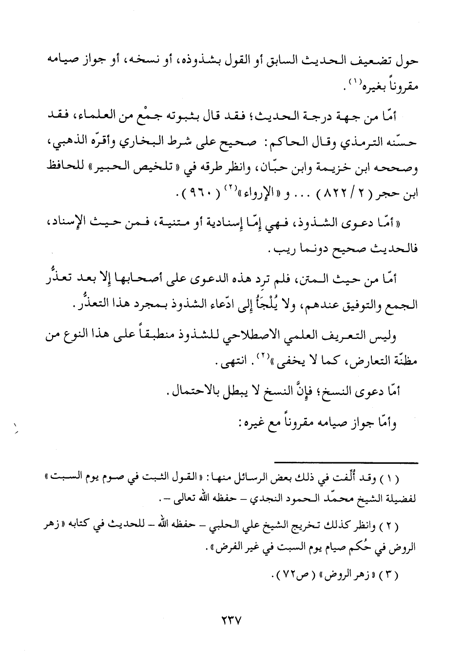 (¬1) وقد أُلِّفت في ذلك بعض الرسائل منها: "القول الثبت في صوم يوم السبت" لفضيلة الشيخ محمّد الحمود النجدي -حفظه الله تعالى-.