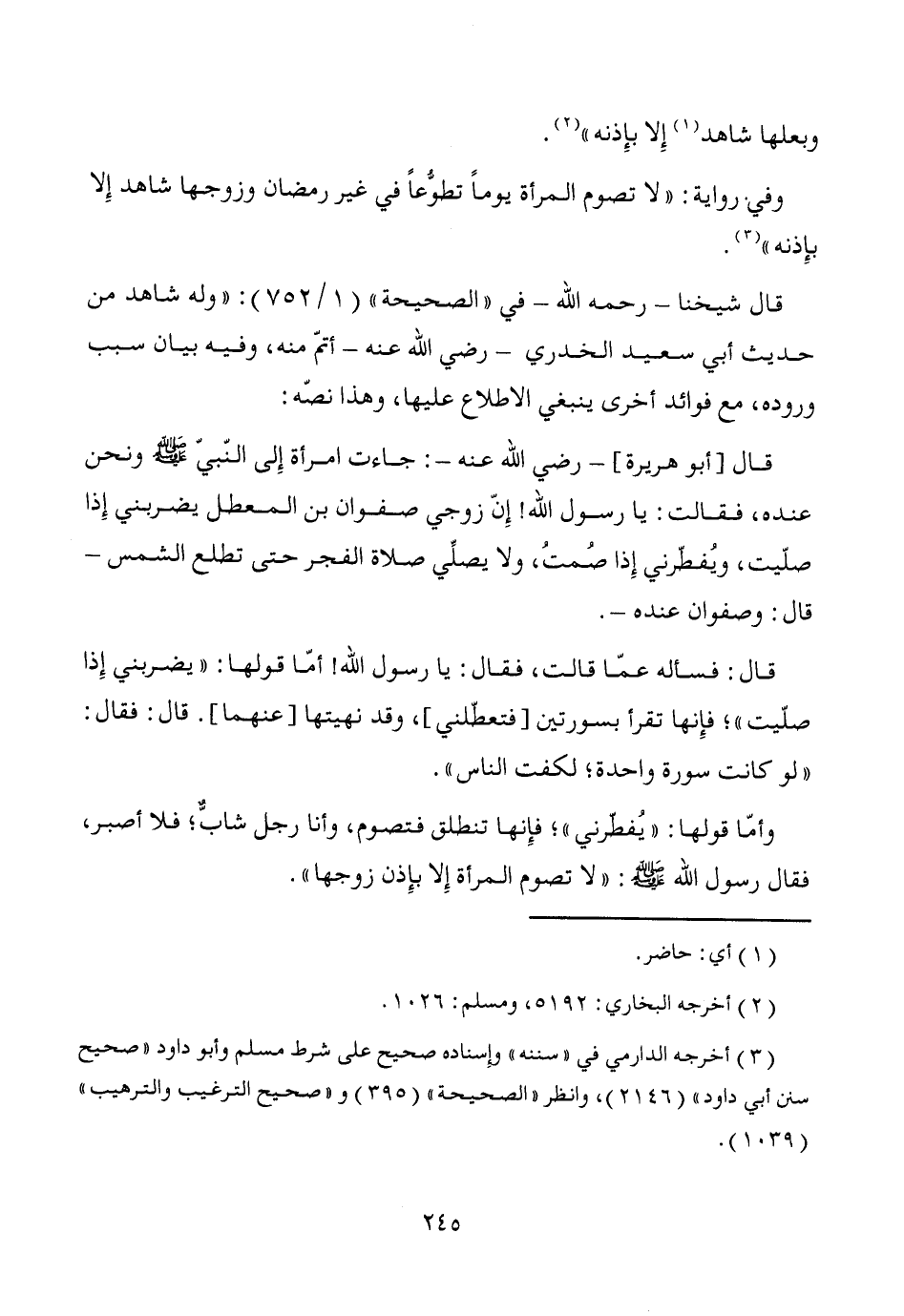 وفي رواية: "لا تصوم المرأة يوماً تطوُّعاً في غير رمضان وزوجها شاهد إِلا بإِذنه" (¬3).
