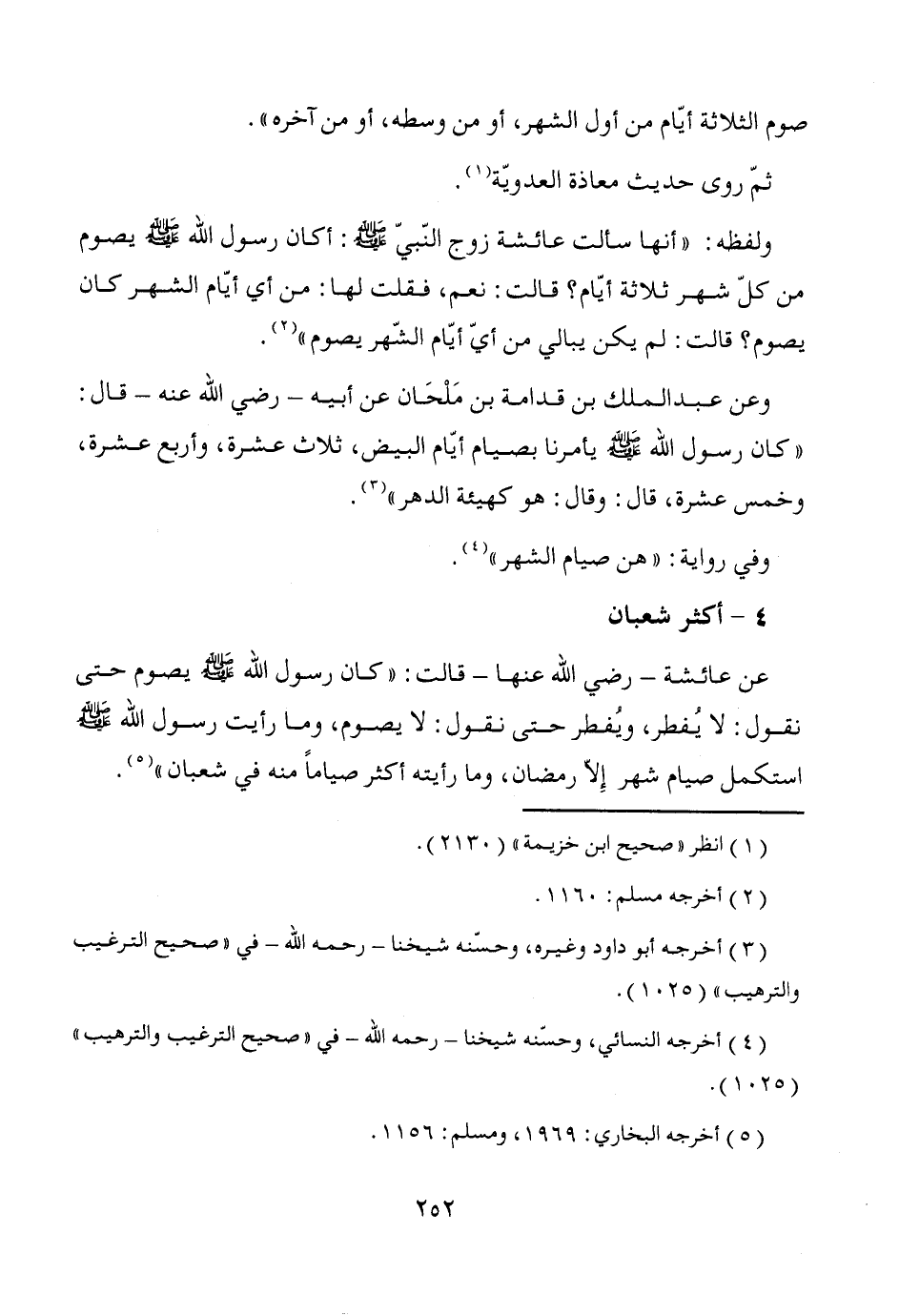 عن عائشة -رضي الله عنها- قالت: "كان رسول الله - صَلَّى اللَّهُ عَلَيْهِ وَسَلَّمَ - يصوم حتى نقول: لا يُفطر، ويُفطر حتى نقول: لا يصوم، وما رأيت رسول الله - صَلَّى اللَّهُ عَلَيْهِ وَسَلَّمَ - استكمل صيام شهر إلاَّ رمضان، وما رأيته أكثر صياماً منه في شعبان" (¬5).