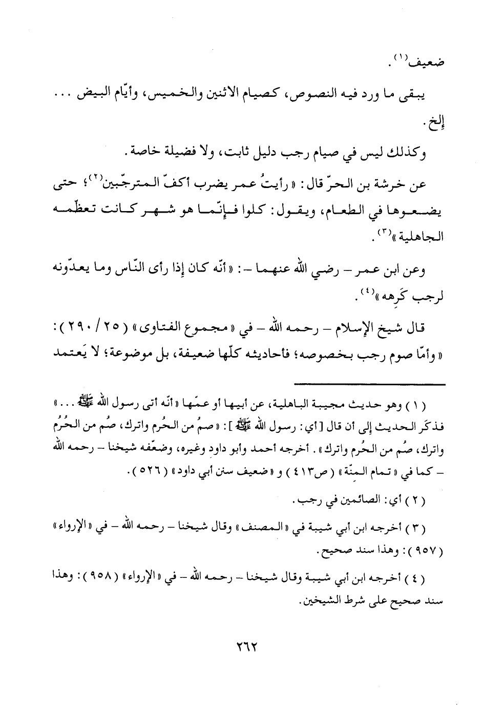 وعن ابن عمر -رضي الله عنهما-: "أنّه كان إِذا رأى النّاس وما يعدّونه لرجب كَرِهه" (¬4).