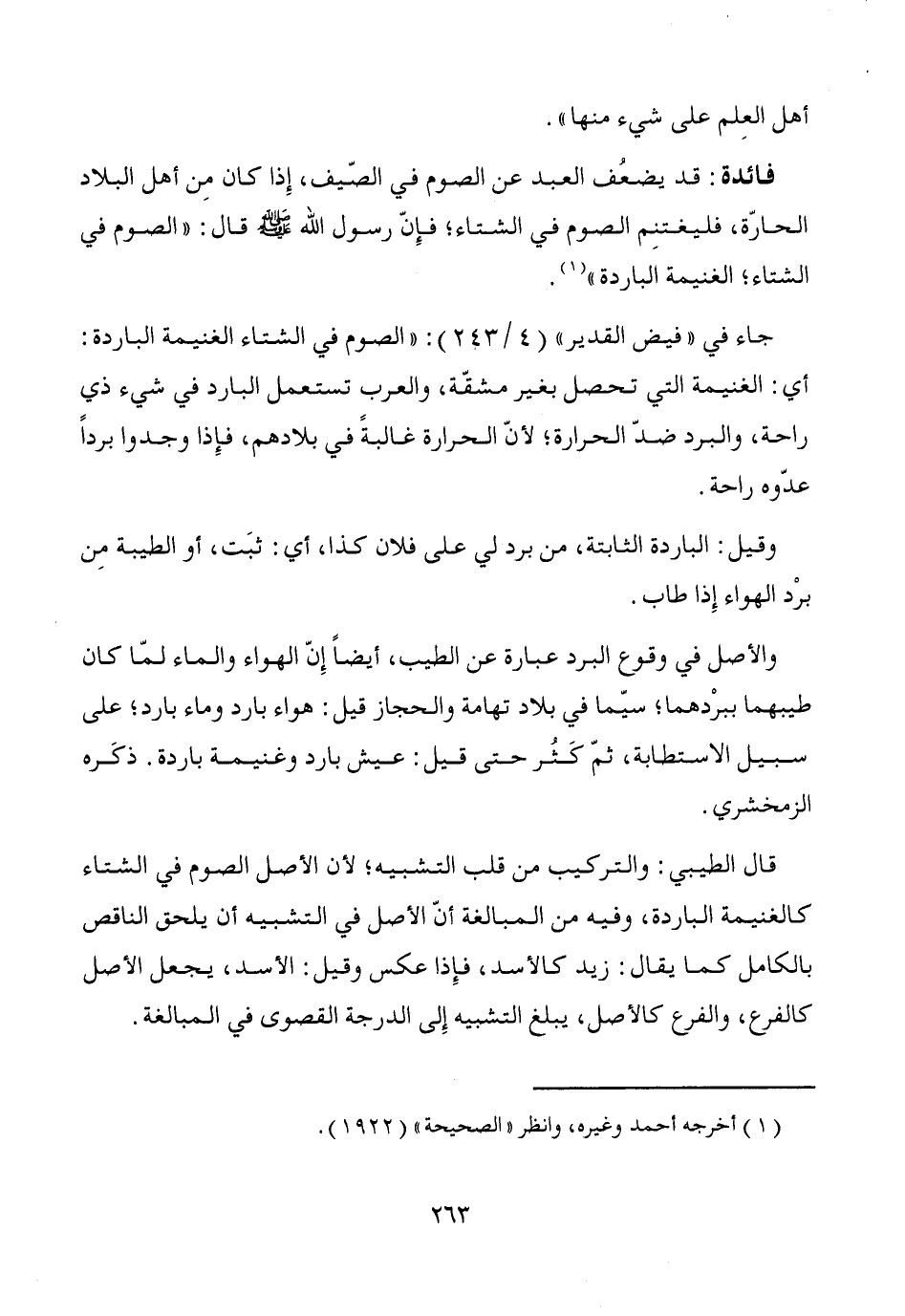قال الطيبي: والتركيب من قلب التشبيه؛ لأن الأصل الصوم في الشتاء كالغنيمة الباردة، وفيه من المبالغة أنّ الأصل في التشبيه أن يلحق الناقص بالكامل كما يقال: زيد كالأسد، فإِذا عكس وقيل: الأسد، يجعل الأصل كالفرع، والفرع كالأصل، يبلغ التشبيه إِلى الدرجة القصوى في المبالغة.