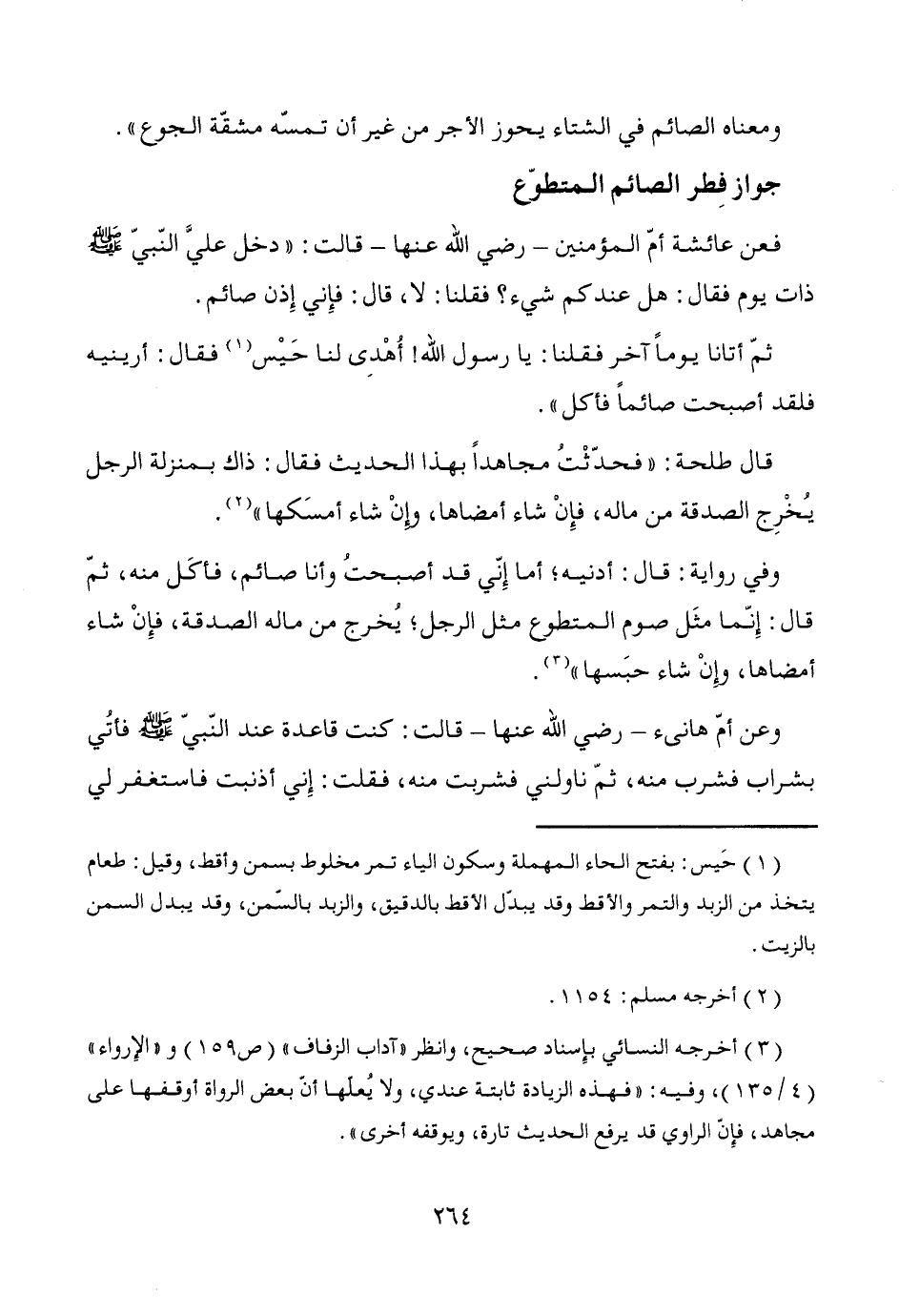 وفي رواية: قال: أدنيه؛ أما إِنّي قد أصبحتُ وأنا صائم، فأكَل منه، ثمّ قال: إِنّما مثل صوم المتطوع مثل الرجل؛ يُخرج من ماله الصدقة، فإِنْ شاء أمضاها، وإِنْ شاء حبَسها" (¬3).