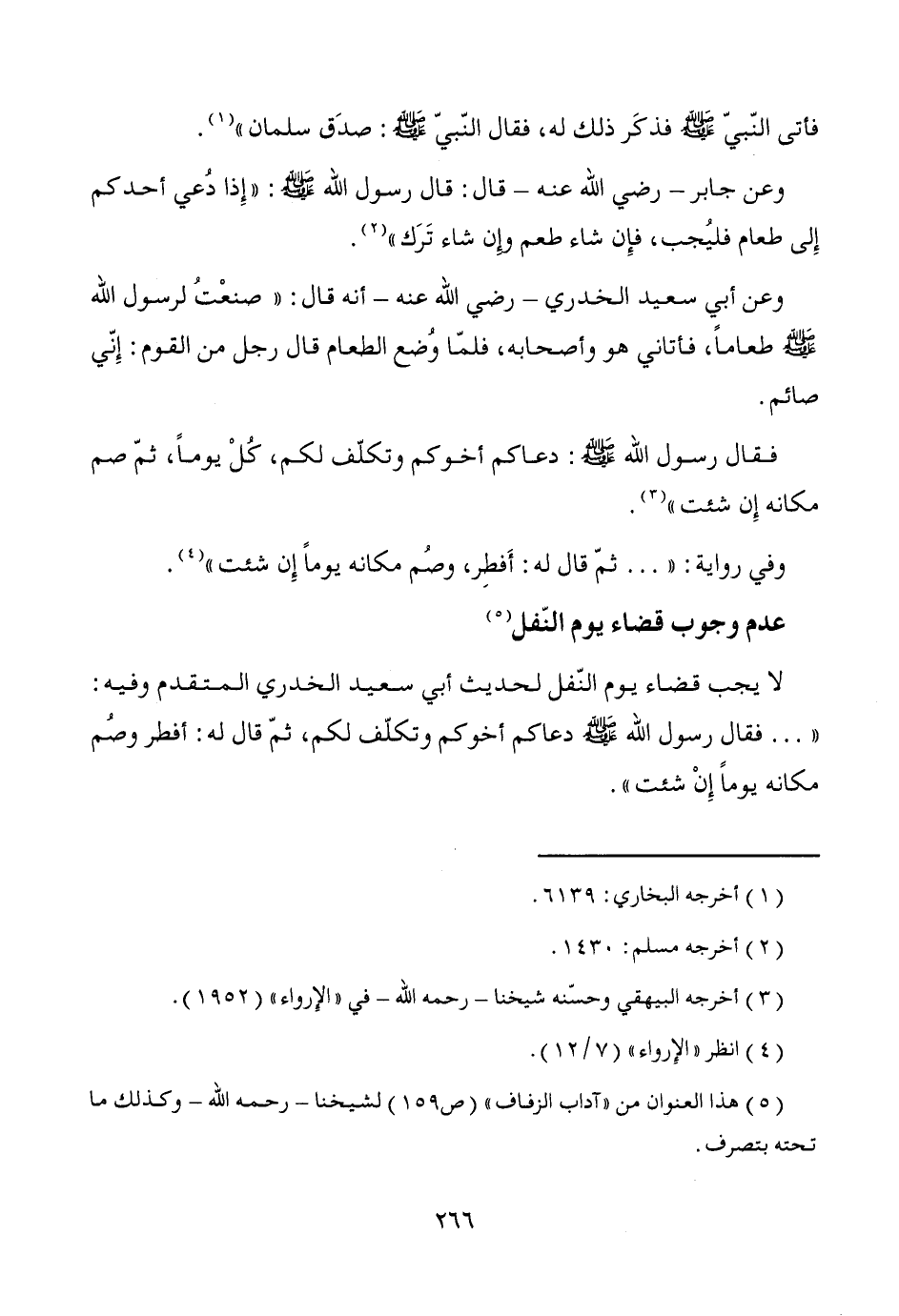 وعن أبي سعيد الخدري -رضي الله عنه- أنه قال: "صنعْتُ لرسول الله - صَلَّى اللَّهُ عَلَيْهِ وَسَلَّمَ - طعاماً، فأتاني هو وأصحابه، فلمّا وُضع الطعام قال رجل من القوم: إِنّي صائم.