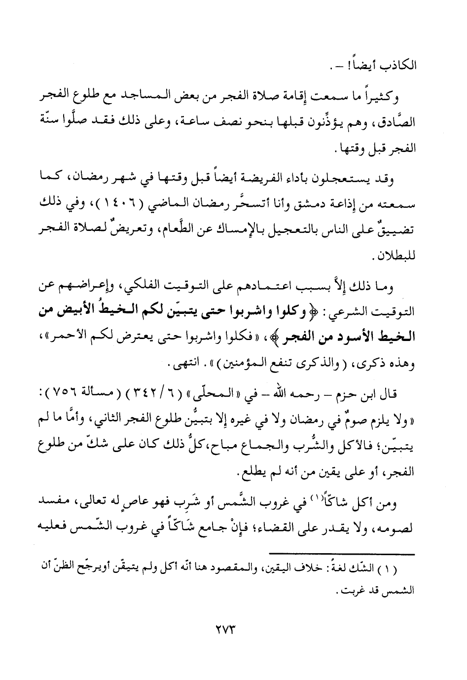 قال ابن حزم -رحمه الله- في "المحلّى" (6/ 342) (مسألة 756): "ولا يلزم صومٌ في رمضان ولا في غيره إِلا بتبيُّن طلوع الفجر الثاني، وأمَّا ما لم يتبيّن؛ فالأكل والشُّرب والجماع مباح، كلُّ ذلك كان على شكّ من طلوع الفجر، أو على يقين من أنه لم يطلع.