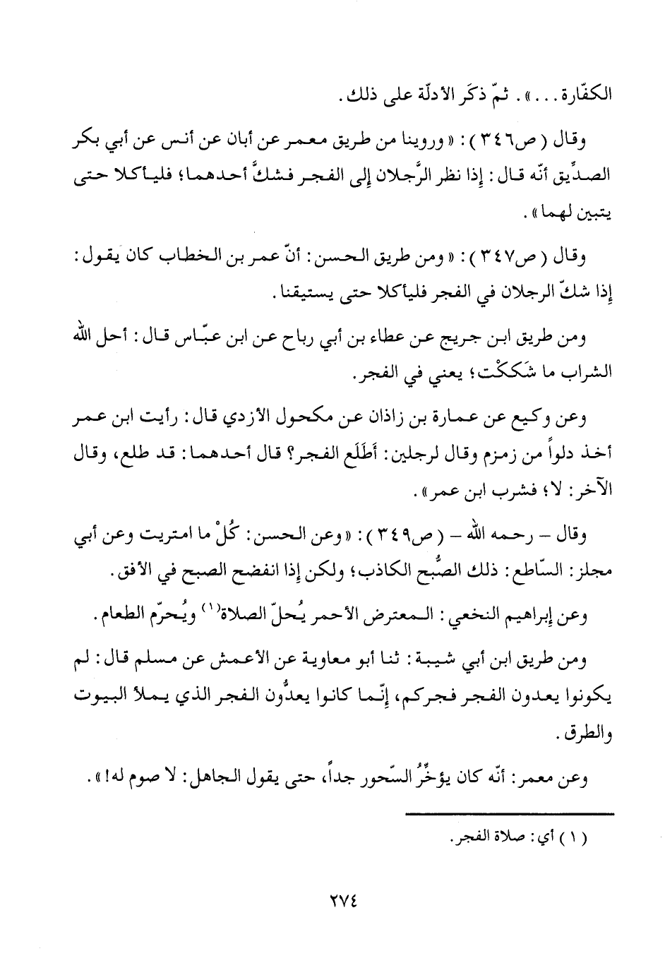 وقال (ص 347): "ومن طريق الحسن: أنّ عمر بن الخطاب كان يقول: إِذا شكّ الرجلان في الفجر فليأكلا حتى يستيقنا.