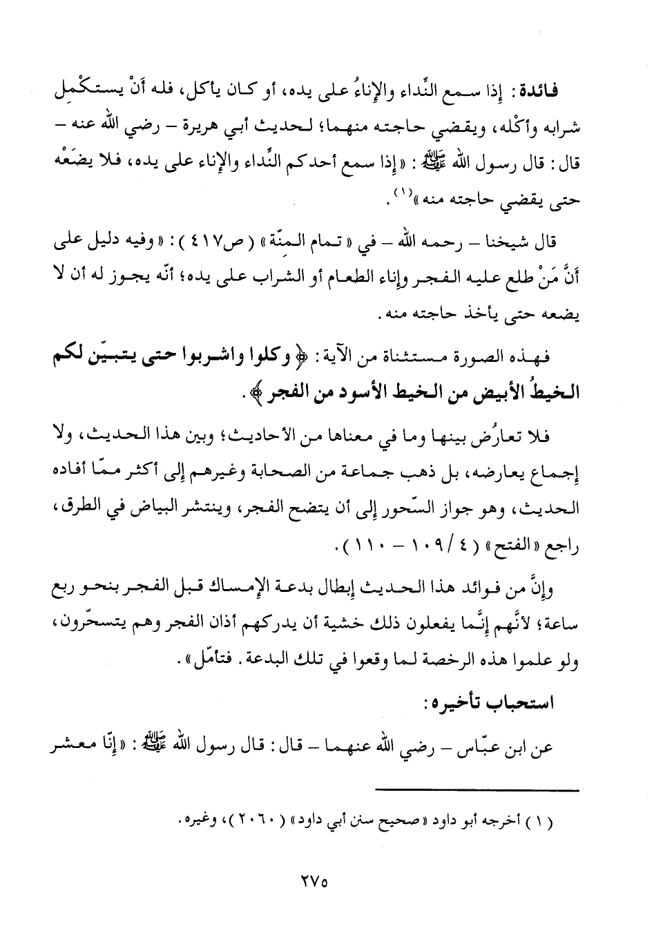قال شيخنا -رحمه الله- في "تمام المِنّة" (ص 417): "وفيه دليل على أَنَّ مَنْ طلع عليه الفجر وإناء الطعام أو الشراب على يده؛ أنّه يجوز له أن لا يضعه حتى يأخذ حاجته منه.