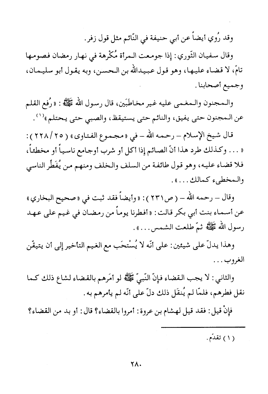 وقال -رحمه الله- (ص 231): "وأيضاً فقد ثبت في "صحيح البخاري" عن أسماء بنت أبي بكر قالت: "أفطرنا يوماً من رمضان في غيم على عهد رسول الله - صَلَّى اللَّهُ عَلَيْهِ وَسَلَّمَ - ثمّ طلعت الشمس ... ".