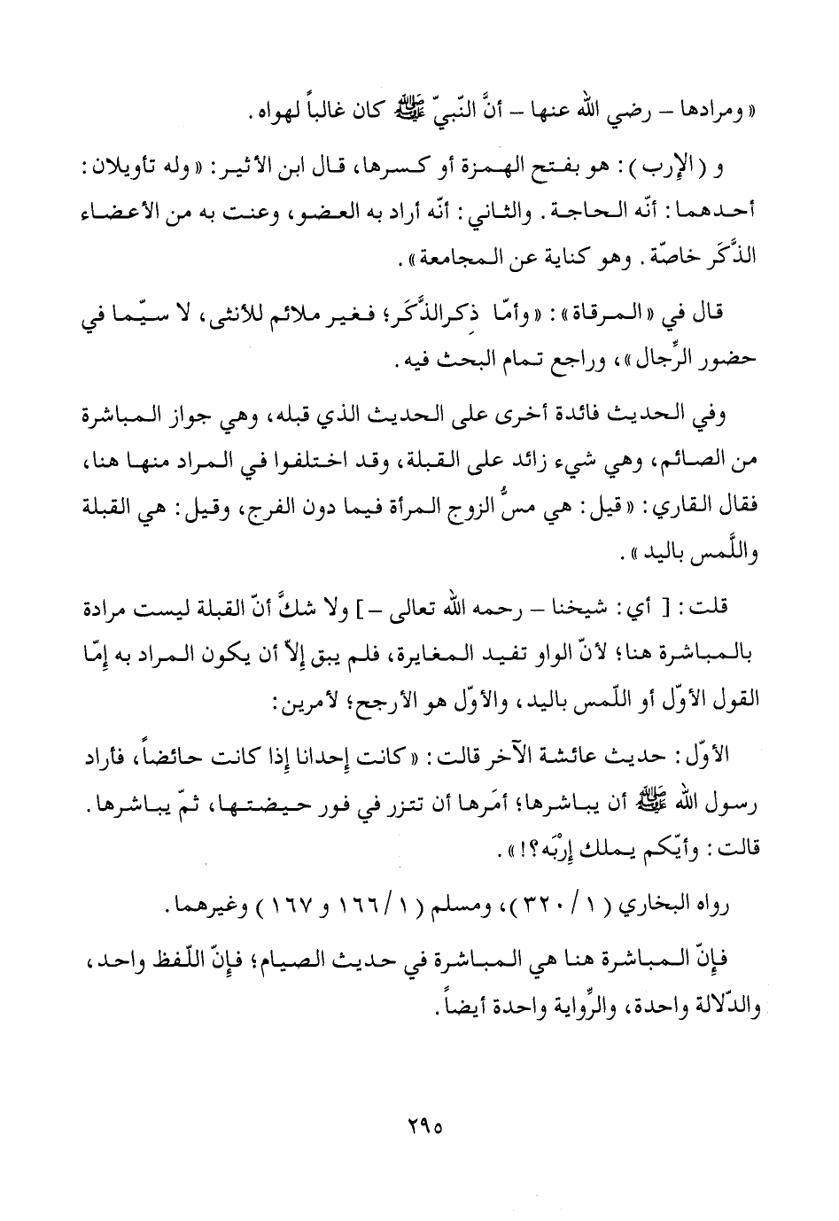 قلت: [أي: شيخنا -رحمه الله تعالى-] ولا شكَّ أنّ القبلة ليست مرادة بالمباشرة هنا؛ لأنّ الواو تفيد المغايرة، فلم يبق إلاَّ أن يكون المراد به إِمّا القول الأوّل أو اللّمس باليد، والأوّل هو الأرجح، لأمرين: