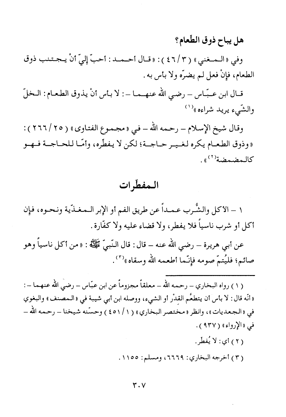 (¬1) رواه البخاري -رحمه الله- معلقاً مجزوماً عن ابن عبّاس -رضي الله عنهما-: "أنّه قال: لا بأس أن يتطعَّم القِدْر أو الشيء، ووصله ابن أبي شيبة في "المصنف" والبغوي في "الجعديات"، وانظر "مختصر البخاري" (1/ 451) وحسّنه شيخنا -رحمه الله- في "الإِرواء" (937).