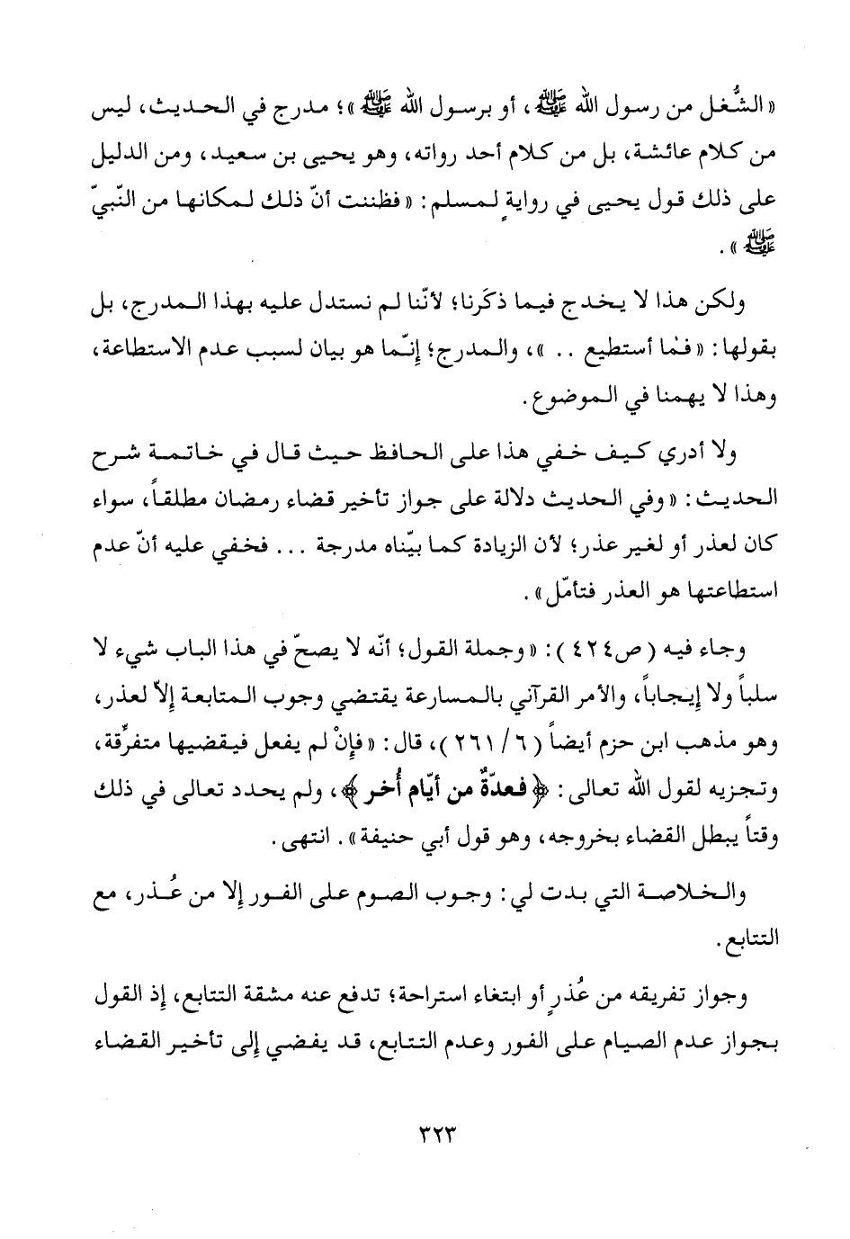 وجاء فيه (ص424): "وجملة القول؛ أنّه لا يصحّ في هذا الباب شيء لا سلباً ولا إِيجاباً، والأمر القرآني بالمسارعة يقتضي وجوب المتابعة إلاَّ لعذر، وهو مذهب ابن حزم أيضاً (6/ 261)، قال: "فإِنْ لم يفعل فيقضيها متفرِّقة، وتجزيه لقول الله تعالى: {فعدّةٌ من أيّام أُخر}، ولم يحدد تعالى في ذلك وقتاً يبطل القضاء بخروجه، وهو قول أبي حنيفة". انتهى.