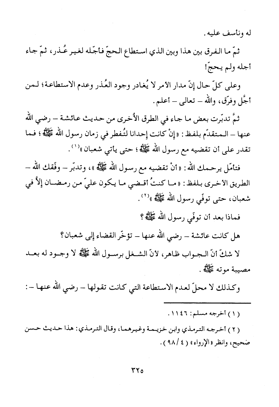 فتأمّل يرحمك الله: "أنْ تقضيه مع رسول الله - صَلَّى اللَّهُ عَلَيْهِ وَسَلَّمَ -"، وتدبّر -وفّقك الله- الطريق الأخرى بلفظ: "ما كنتُ أقضي ما يكون عليّ من رمضان إلاَّ في شعبان، حتى توفّي رسول الله - صَلَّى اللَّهُ عَلَيْهِ وَسَلَّمَ -" (¬2).