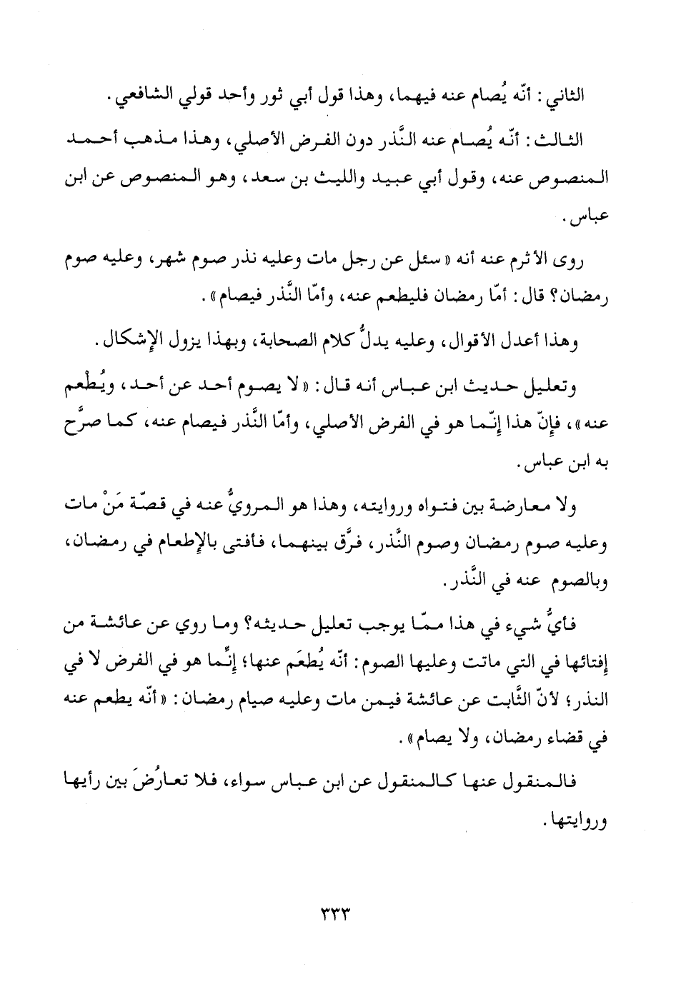 وتعليل حديث ابن عباس أنه قال: "لا يصوم أحد عن أحد، ويُطْعم عنه"، فإِنّ هذا إِنّما هو في الفرض الأصلي، وأمّا النَّذر فيصام عنه، كما صرَّح به ابن عباس.