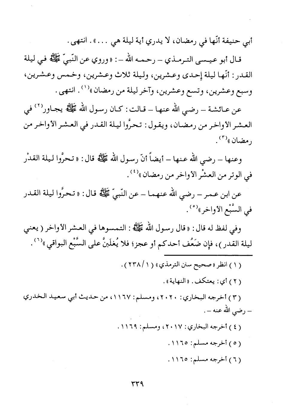 قال أبو عيسى الترمذي -رحمه الله-: "وروي عن النّبيّ - صَلَّى اللَّهُ عَلَيْهِ وَسَلَّمَ - في ليلة القدر: أنّها ليلة إِحدى وعشرين، وليلة ثلاث وعشرين، وخمس وعشرين، وسبع وعشرين، وتسع وعشرين، وآخر ليلة من رمضان" (¬1). انتهى.