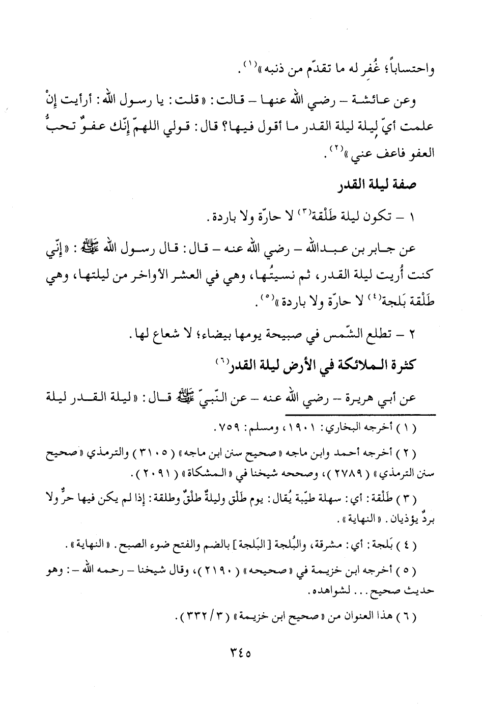 عن جابر بن عبد الله -رضي الله عنه- قال: قال رسول الله - صَلَّى اللَّهُ عَلَيْهِ وَسَلَّمَ -: "إِنّي كنت أُريت ليلة القدر، ثم نسيتُها، وهي في العشر الأواخر من ليلتها، وهي طَلْقة بَلجة (¬4) لا حارّة ولا باردة" (¬5).