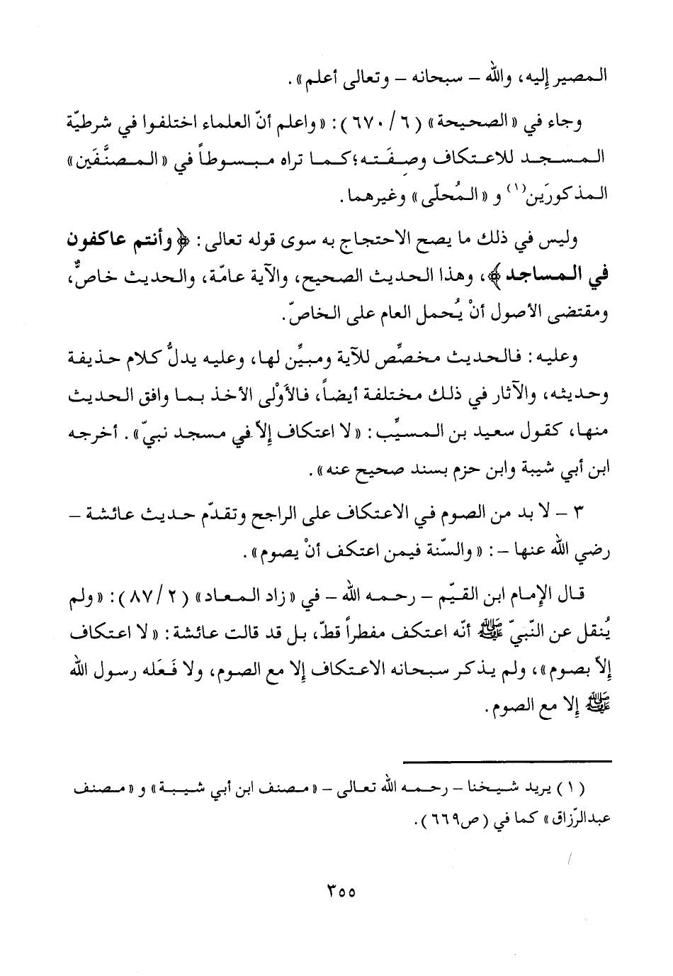 وجاء في "الصحيحة" (6/ 670): "واعلم أنّ العلماء اختلفوا في شرطيّة المسجد للاعتكاف وصِفَته؛ كما تراه مبسوطاً في "المصنَّفَين" المذكورَين (¬1) و"المُحلّى" وغيرهما.