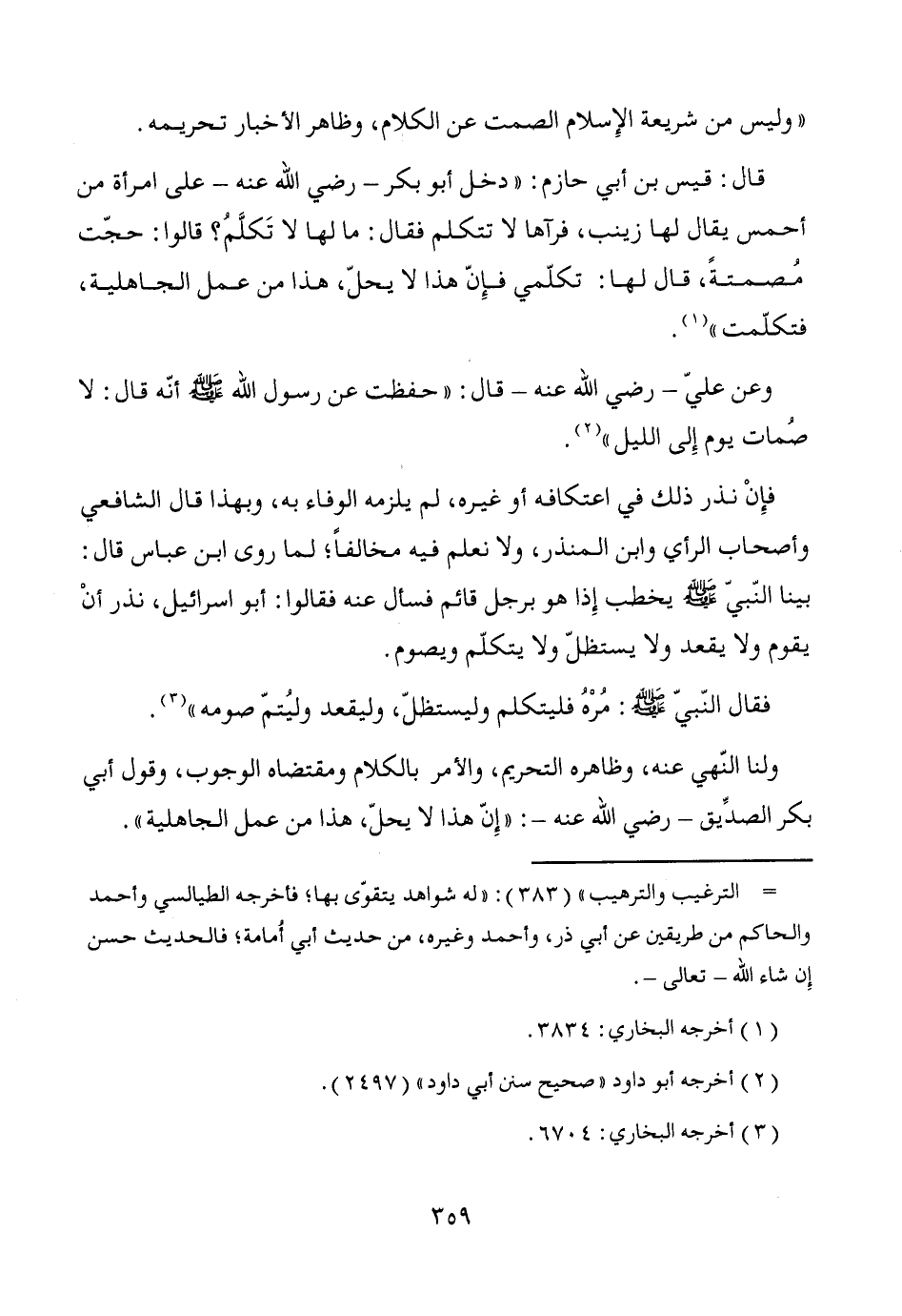 قال: قيس بن أبي حازم: "دخل أبو بكر -رضي الله عنه- على امرأة من أحمس يقال لها زينب، فرآها لا تتكلم فقال: ما لها لا تَكلَّمُ؟ قالوا: حجّت مُصمتةً، قال لها: تكلّمي فإِنّ هذا لا يحلّ، هذا من عمل الجاهلية، فتكلّمت" (¬1).