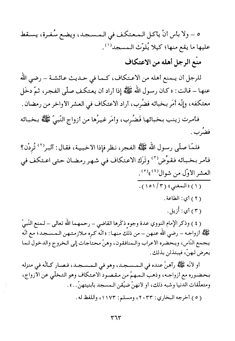 5 - ولا بأس أنْ يأكل المعتكف في المسجد، ويضع سُفرة، يسقط عليها ما يقع منها؛ كيلا يُلوّث المسجد (¬1).