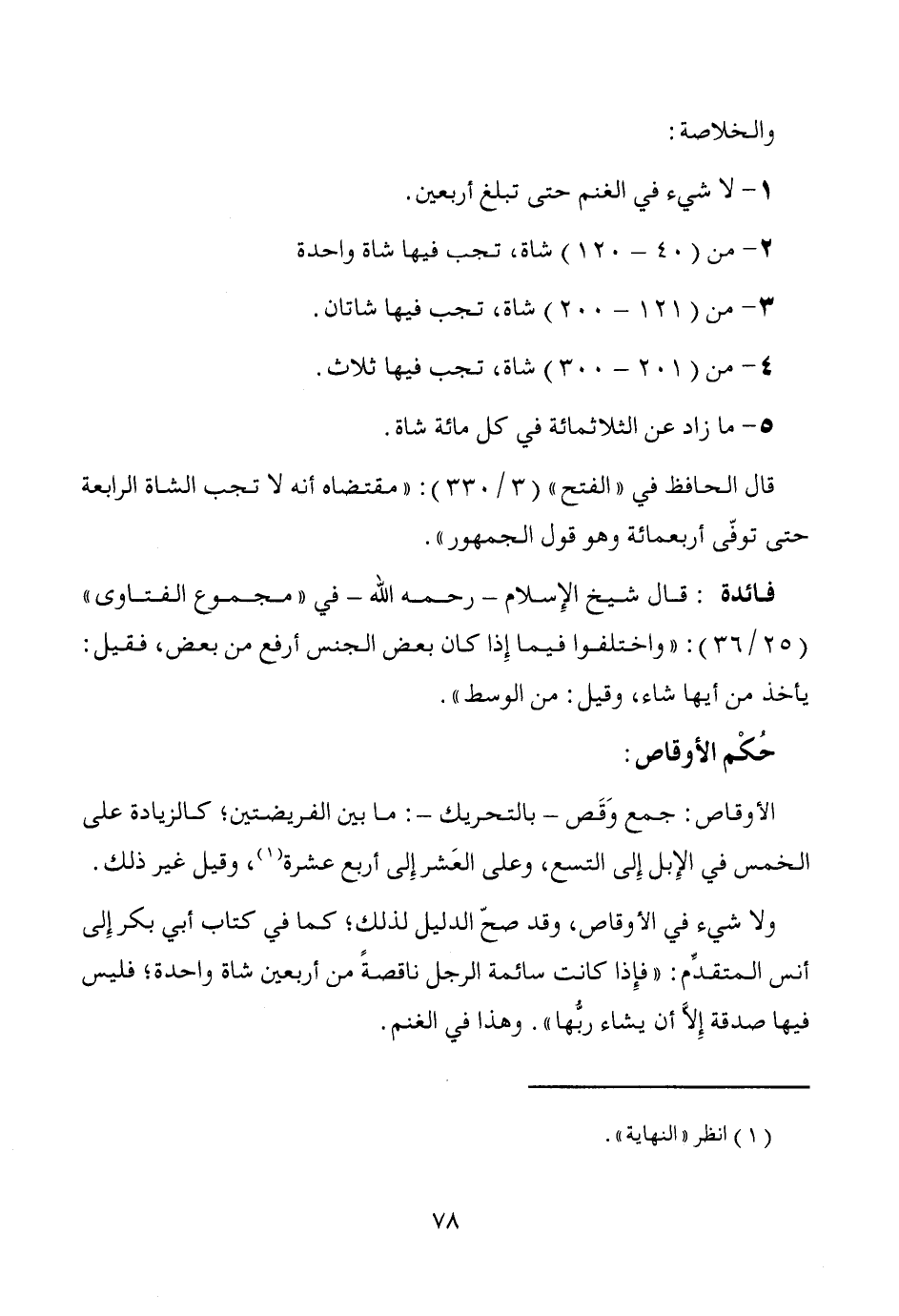 ولا شيء في الأوقاص، وقد صحّ الدليل لذلك؛ كما في كتاب أبي بكر إِلى أنس المتقدِّم: "فإِذا كانت سائمة الرجل ناقصةً من أربعين شاة واحدة؛ فليس فيها صدقة إلاَّ أن يشاء ربُّها". وهذا في الغنم.