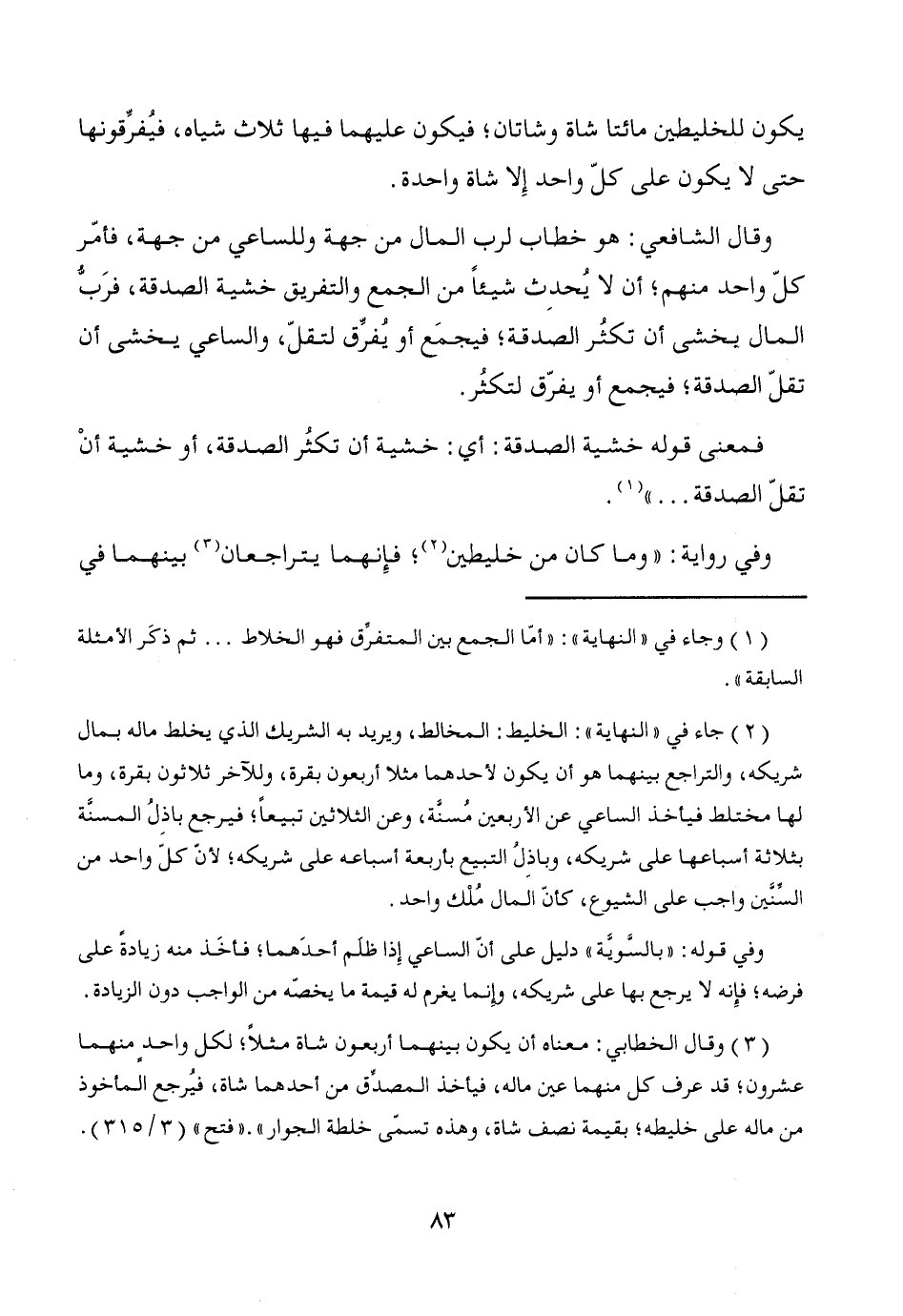 وقال الشافعي: هو خطاب لرب المال من جهة وللساعي من جهة، فأمّر كلّ واحد منهم؛ أن لا يُحدِث شيئاً من الجمع والتفريق خشية الصدقة، فرَبُّ المال يخشى أن تكثُر الصدقة؛ فيجمَع أو يُفرِّق لتقلّ، والساعي يخشى أن تقلّ الصدقة؛ فيجمع أو يفرّق لتكثُر.