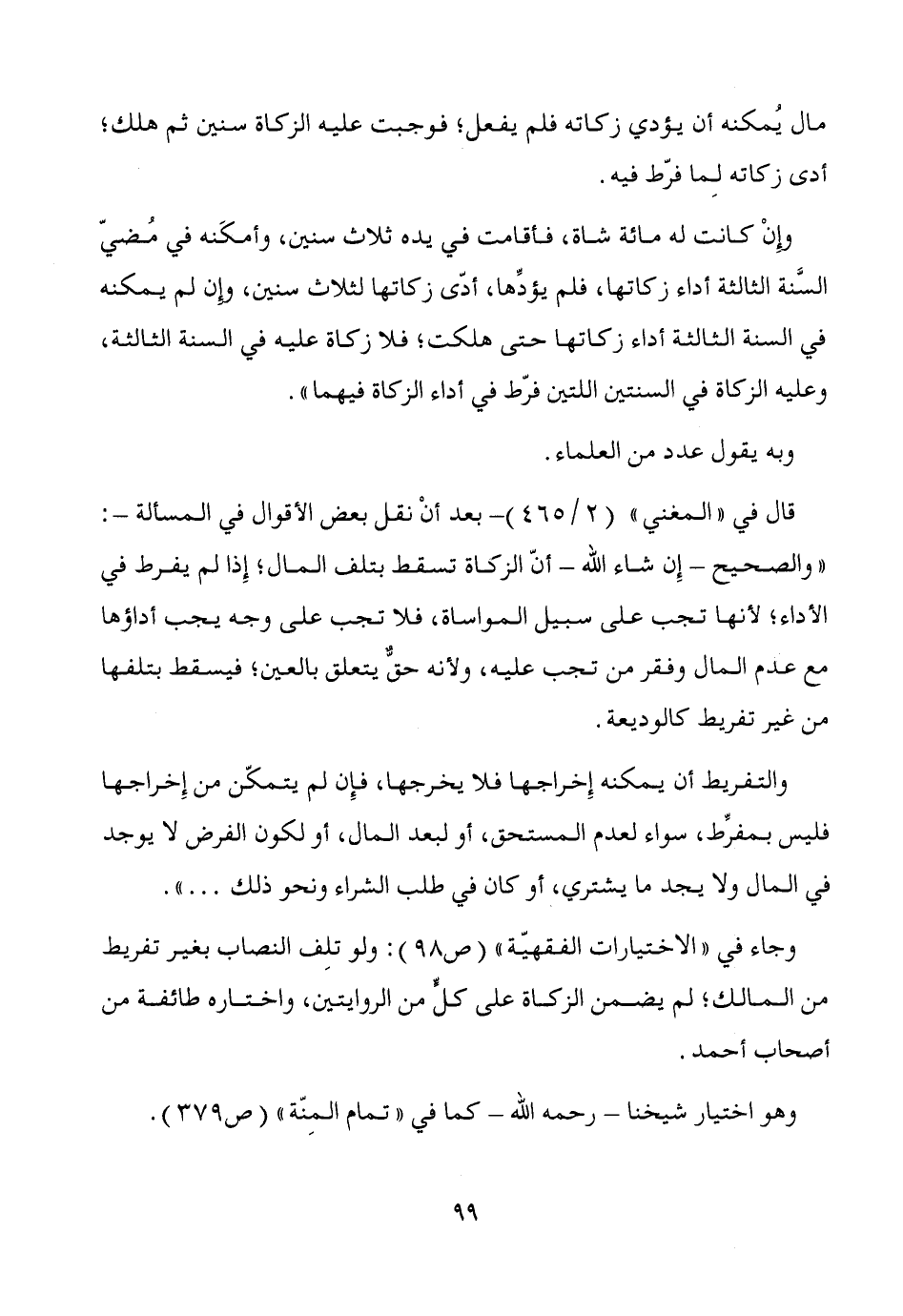 وجاء في "الاختيارات الفقهيّة" (ص 98): ولو تلِف النصاب بغير تفريط من المالك؛ لم يضمن الزكاة على كلٍّ من الروايتين، واختاره طائفة من أصحاب أحمد.