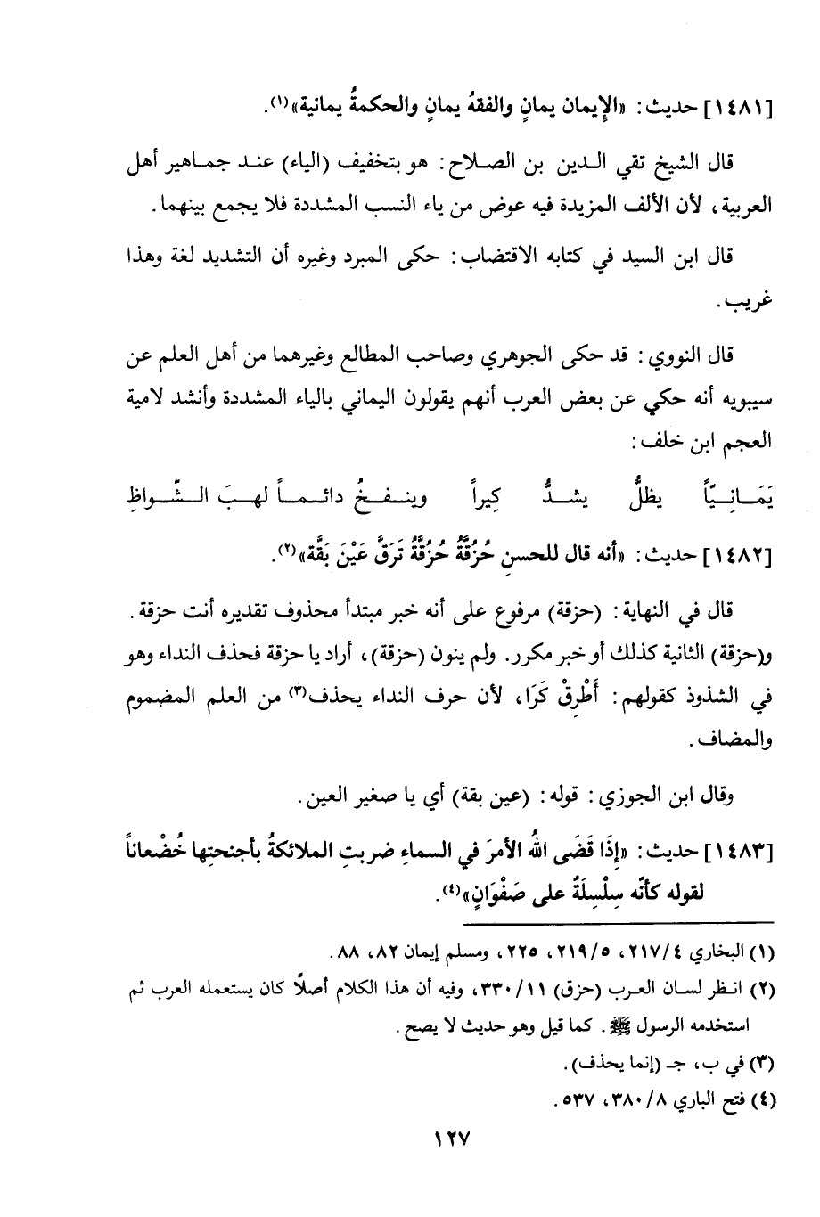 قال النووي: قد حكى الجوهري وصاحب المطالع وغيرهما من أهل العلم عن سيبويه أنه حكي عن بعض العرب أنهم يقولون اليماني بالياء المشددة وأنشد لامية العجم بن خلف:
