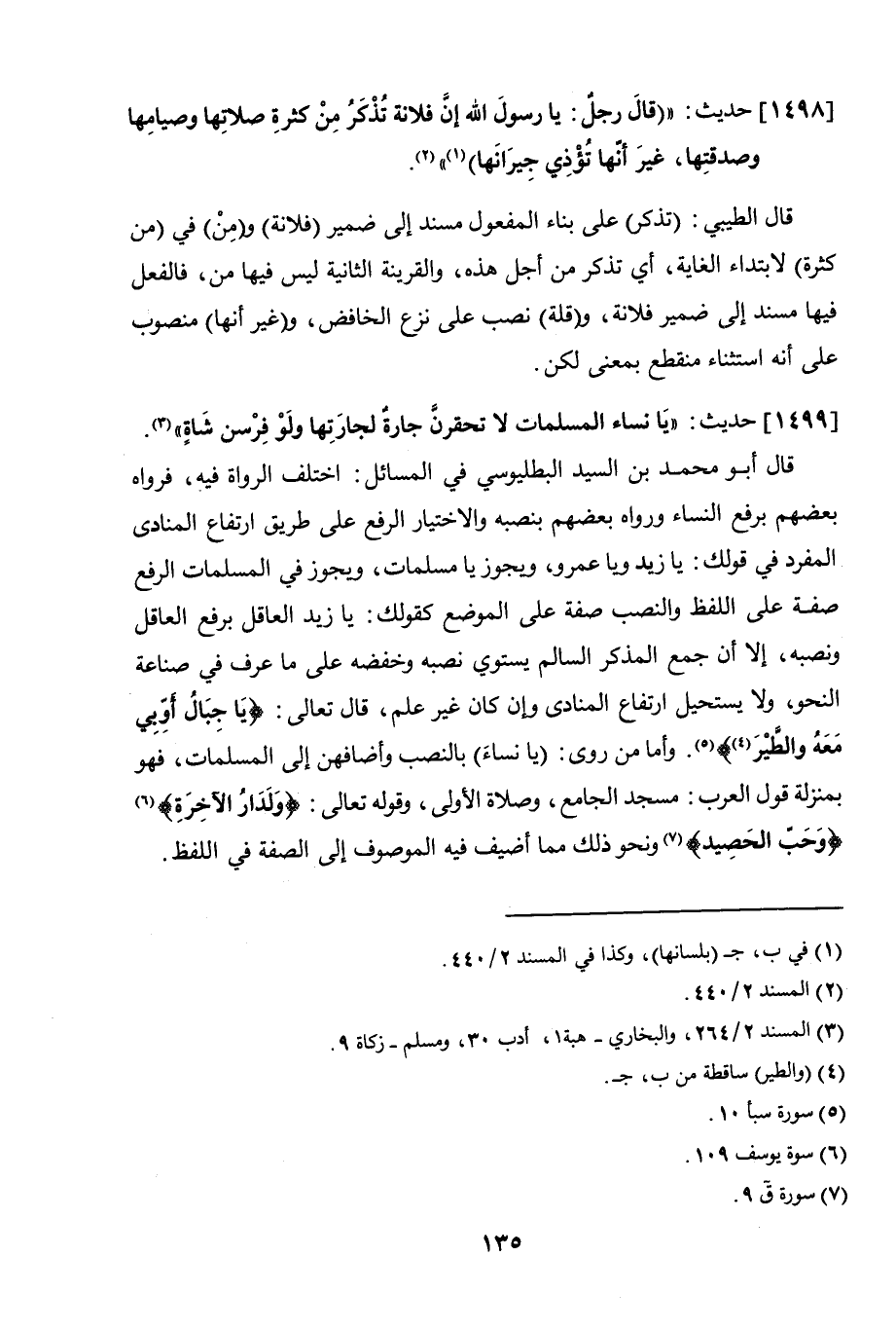 قال أبو محمد بن السيد البطليوسي في المسائل: اختلف الرواة فيه، فرواه بعضهم برفع النساء ورواه بعضهم بنصبه والاختيار الرفع على طريق ارتفاع المنادى المفرد في قولك: يا زيد ويا عمرو، ويجوز يا مسلمات، ويجوز في المسلمات الرفع صفة على اللفظ والنصب صفة على الموضع كقولك: يا زيد العاقل برفع العاقل ونصبه، إلا أن جمع المذكر السالم يستوي نصبه وخفضه على ما عرف في صناعة النحو، ولا يستحيل ارتفاع المنادى وإن كان غير علم، قال تعالى: (يا جبالُ أوبي معه والطيرَ) [سبأ: 10]. وأما من روى: (يا نساءَ) بالنصب وأضافهن إلى المسلمات، فهو بمنزلة قول العرب: مسجد الجامع، وصلاة الأولى، وقوله تعالى: (ولدارُ الآخرة) [يوسف: 109] (وحب الحصيد) [ق: 9] ونحو ذلك مما أضيف فيه الموصوف إلى الصفة في اللفظ.