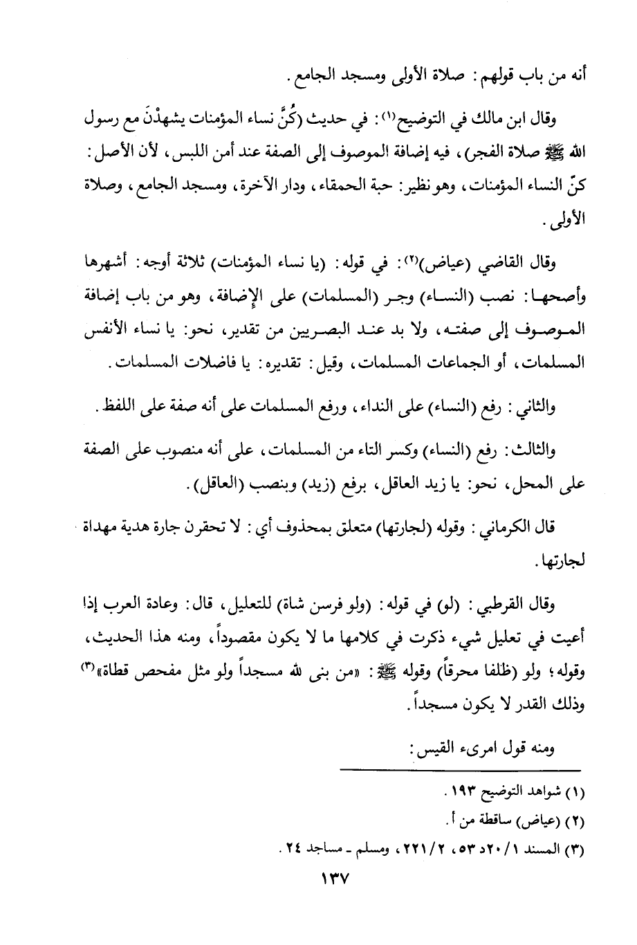 وقال ابن مالك في التوضيح: في حديث: "كن نساء المؤمنات يشهدن مع رسول الله صلى الله عليه وسلم صلاة الفجر)، فيه إضافه الموصوف إلى الصفة عند أمن اللبس، لأن الأصل: كن النساء المؤمنات. وهو نظير (حبة الحمقاء) و (دار الآخرة) و (مسجد الجامع) و (صلاة الأولى).
