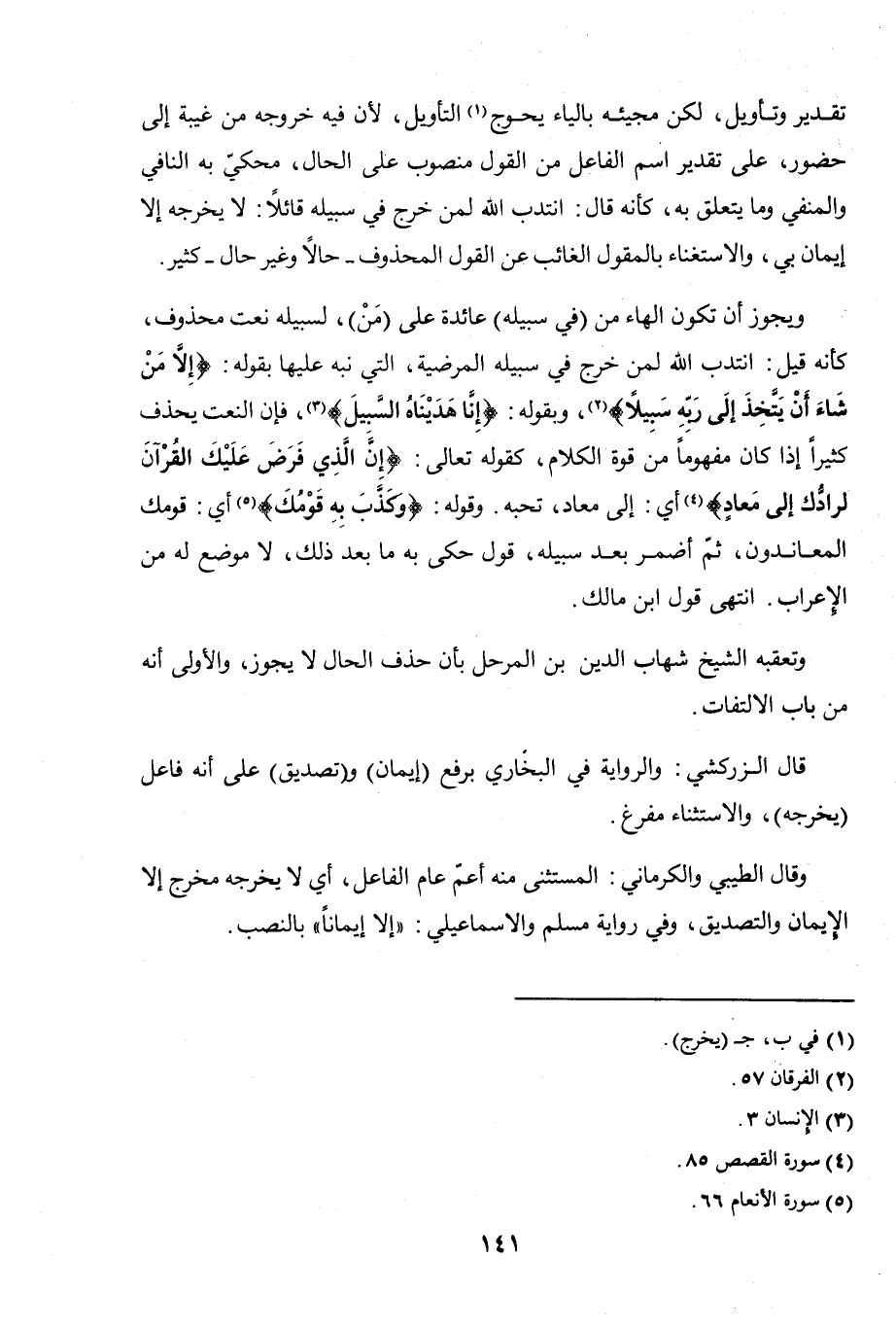 قال الزركشي: والرواية في البخاري برفع (إيمان) و (تصديق) على أنه فاعل (يخرجه)، والاستثناء مفرغ.
