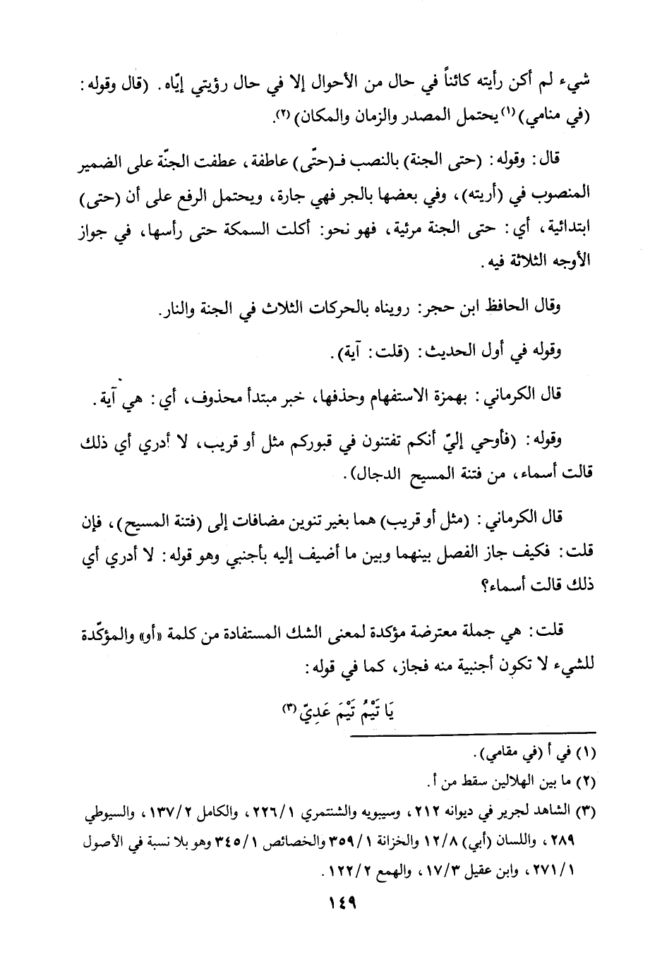 قال: وقوله: (حتى الجنة) بالنصب فـ (حتى) عاطفة، عطفت الجنة على الضمير المنصوب في (أريته)، وفي بعضها بالجر فهي جارة، ويحتمل الرفع على أن (حتى) ابتدائية، أي: حتى الجنة مرئية، فهو نح: أكلت السمكة حتى رأسها، في جواز الأوجه الثلاثة فيه.