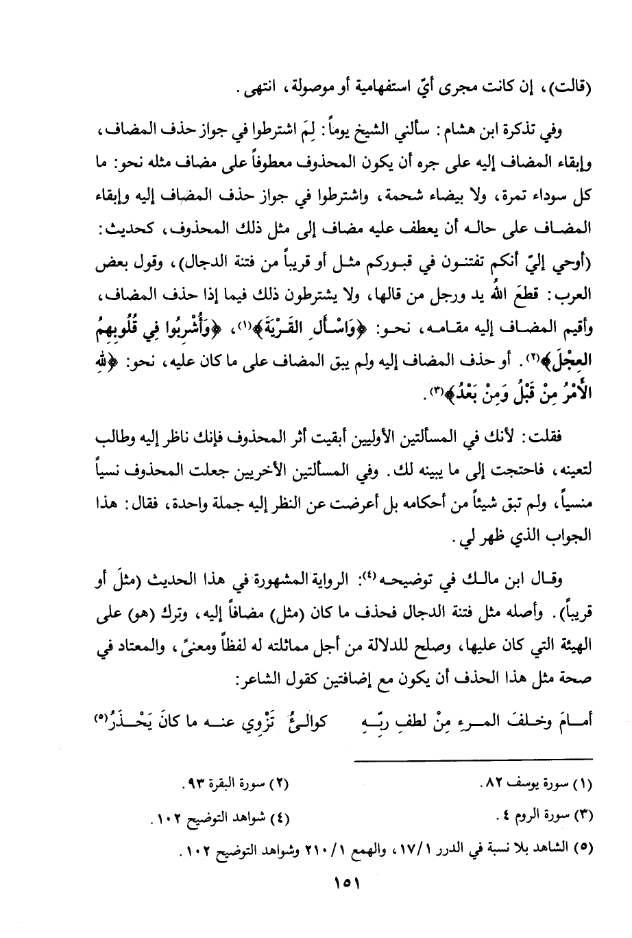 وفي تذكرة ابن هشام: سألني الشيخ يومًا: لم اشترطوا في جواز حذف المضاف، وإبقاء المضاف إليه على جره أن يكون المحذوف معطوفًا على مضاف مثله نحو: ما كل سوداء تمرة، ولا بيضاء شحمة، واشترطوا في جواز حذف المضاف إليه وإبقاء المضاف على حاله أن يعطف عليه مضاف إلى مثل ذلك المحذوف، كحديث: (أوحي إليّ أنكم تفتنون في قبوركم مثل أو قريبًا من فتنة الدجال)، وقول بعض العرب: قطع الله يد ورجل من قالها، ولا يشترطون ذلك فيما إذا حذف المضاف وأقيم المضاف إليه مقامه، نحو: (واسأل القرية) [يوسف: 82]، (وأشربوا في قلوبهم العجل) [البقرة: 93]. أو حذف المضاف إليه ولم يبق المضاف على ما كان عليه، نحو: (لله الأمر من قبل ومن بعد) [الروم: 4].