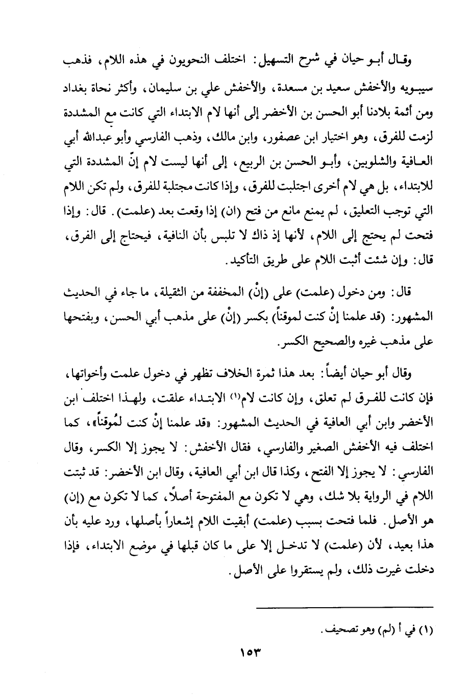 وقال أبو حيان في شرح التسهيل: اختلف النحويون في هذه اللام، فذهب سيبويه والأخفش سعيد بن مسعدة، والأخفش علي بن سليمان، وأكثر نحاة بغداد ومن أئمة بلادنا أبو الحسن بن الأخضر إلى أنها لام الابتداء التي كانت مع المشددة لزمت للفرق، وهو اختيار ابن عصفور، وابن مالك، وذهب الفارسي وأبو عبد الله أبي العافية والشلوبين، وأبو الحسن بن الربيع، إلى أنها ليست لام إنّ المشددة التي للابتداء، بل هي لام أخرى اجتلبت للفرق، وإذا كانت مجتلبة للفرق، ولم تكن اللام التي توجب التعليق، لم يمنع مانع من فتح (إن) إذا وقعت بعد (علمت). قال: وإذا فتحت لم يحتج إلى اللام، لأنها إذ ذاك لا تلتبس بأن النافية، فيحتاج إلى الفرق، قال: وإن شئت أثبت اللام على طريق التأكيد.