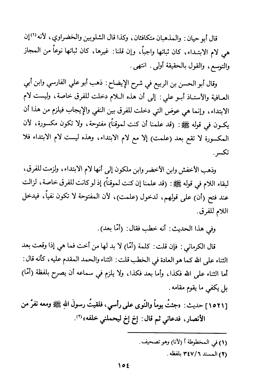 وقال أبو الحسن بن الربيع في شرح الإيضاح: ذهب أبو علي الفارسي وابن أبي العافية والأستاذ أبو علي: إلى أن هذه اللام دخلت للفرق خاصة، وليست لام الابتداء، وإنما هي عوض التي دخلت للفرق بين النفي والإيجاب فيلزم من هذا أن يكون في قوله صلى الله عليه وسلم: (قد علمنا أن كنت لموقنًا) مفتوحة، ولا تكون مكسورة، لأن المكسورة، لا تقع بعد (علمت) إلا مع لام الابتداء، وهذه ليست لام الابتداء فلا تكسر.