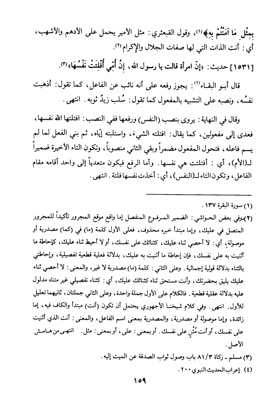 وقال في النهاية: يروى بنصب (النفس) ورفعها، ففي النصب: افتلتها الله نفسها، فعدى إلى مفعولين، كما يقال: افتلته الشيءَ، واستلبته إياه، ثم بني الفعل لما لم يسم فاعله، فتحول المفعول الأول مضمرًا وبقي الثاني منصوبًا، وتكون التاء الأخيرة ضميرًا لـ (الأم). أي افتلتت هي نفسها. وأما الرفع فيكون متعديًا إلى مفعول واحد، أقامه مقام الفاعل، وتكون التاء للنفس: أي أخذت نفسها فلتة. انتهى.