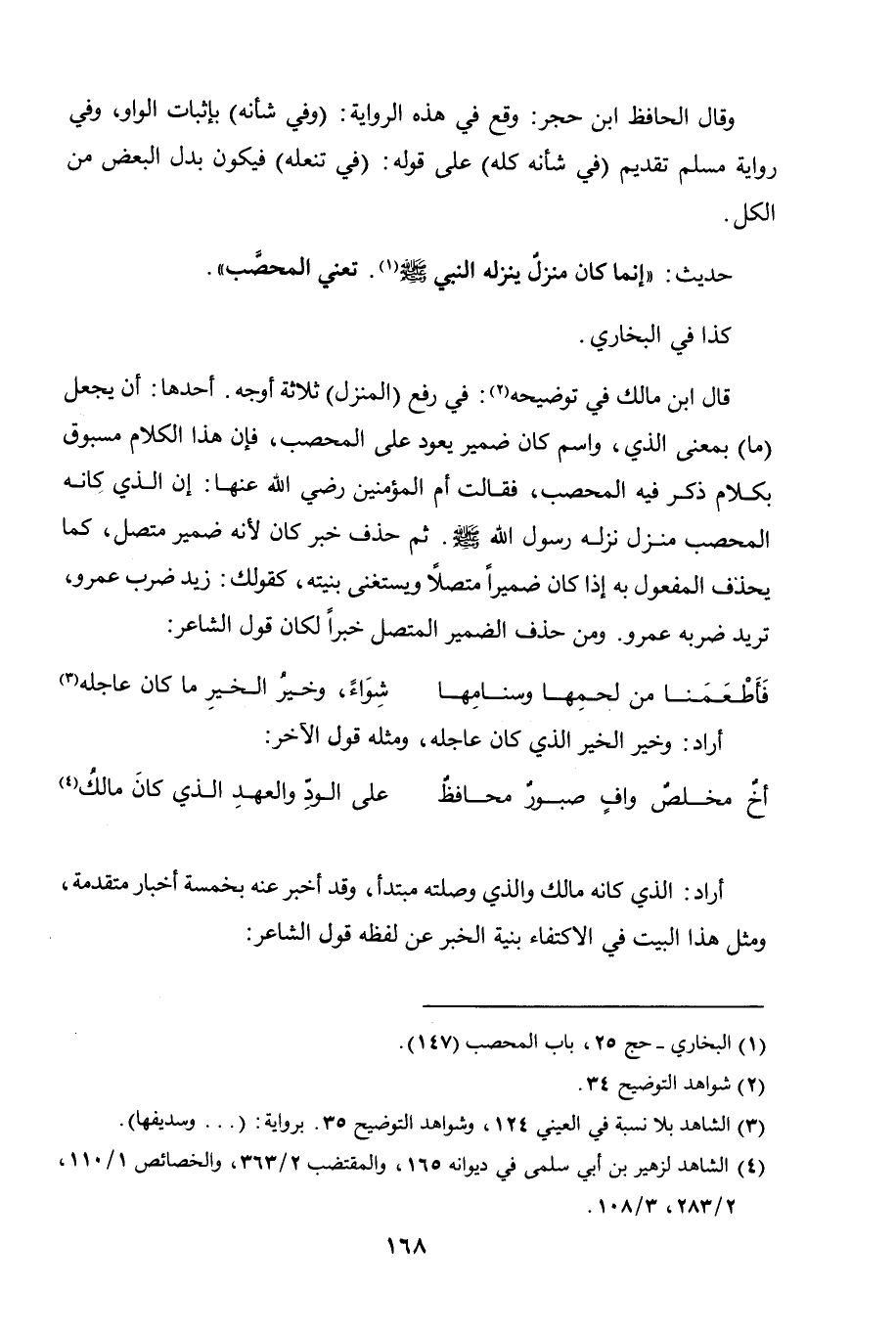 قال ابن مالك في توضيحه: في رفع (المنزل) ثلاثة أوجه: أحدها: أن يجعل "ما" بمعنى (الذي) واسم "كان" ضمير يعود على "المحصب"، فإن هذا الكلام مسبوق بكلام ذكر فيه (المحصب). فقالت أم المؤمنين رضي الله عنها: إن الذي كانه المحصب منزل ينزله رسول الله - صلى الله عليه وسلم -، ثم حذف خبر (كان) لأنه ضمير متصل كما يحذف المفعول به إذا كان ضميرًا متصلاً ويستغنى بنيته. كقولك: زيد ضرب عمرو، تريد: ضربه عمرو. ومن حذف الضمير المتصل خبرًا لـ (كان) قول الشاعر: