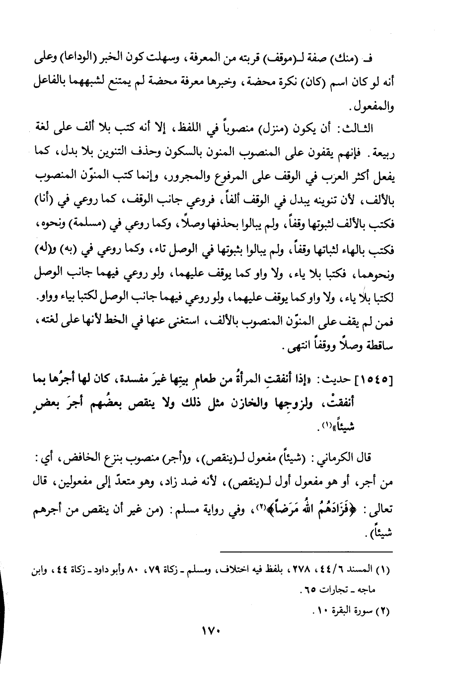 قال الكرماني: (شيئاً) مفعول لينقص، و (أجر) منصوب بنزع الخافض، أي: من أجر، أو هو مفعول أول لـ (ينقص)، لأنه ضد زاد، وهو متعد إلى مفعولين، قال تعالى: (فزادهم الله مرضاً) [البقرة: 10]، وفي رواية مسلم: (من غير أن ينقص من أجرهم شيئًا).