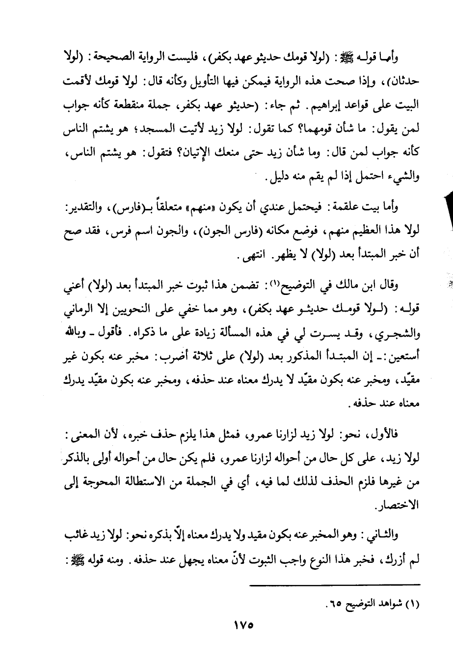 وقال ابن مالك في التوضيح: تضمن هذا الحديث ثبوت خبر المبتدأ بعد "لولا" أعني قوله "لولا قومك حديثو عهد بكفر". وهو مما خفي على النحويين إلا الرماني والشجري. وقد يسرت لي في هذه المسألة زيادة على ما ذكراه، فأقول وبالله أستعين: - إن المبتدأ المذكور بعد "لولا" على ثلاثة أضرب: مخبر عنه بكون غير مقيد، ومخبر عنه بكون مقيد لا يدرك معناه عند حذفه، ومخبر عنه بكون مقيد يدرك معناه عند حذفه.