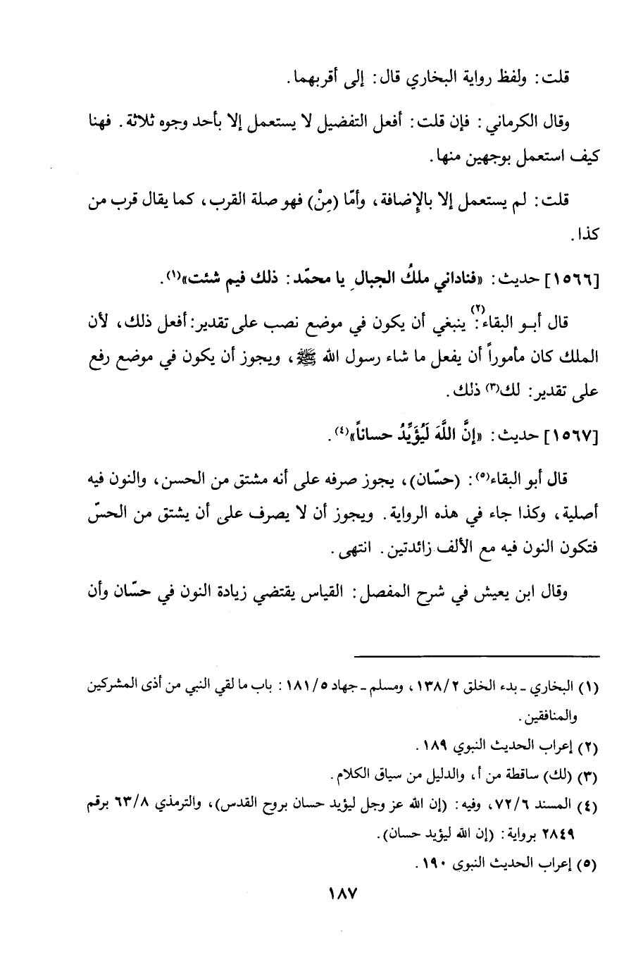 قال أبو البقاء: (حسّان) يجوز صرفه على أنه مشتق من الحسن، والنون فيه أصلية، وكذا جاء في هذه الرواية. ويجوز أن لا يصرف على أن يشتق من الحس، فتكون النون فيه مع الألف زائدتين. انتهى.